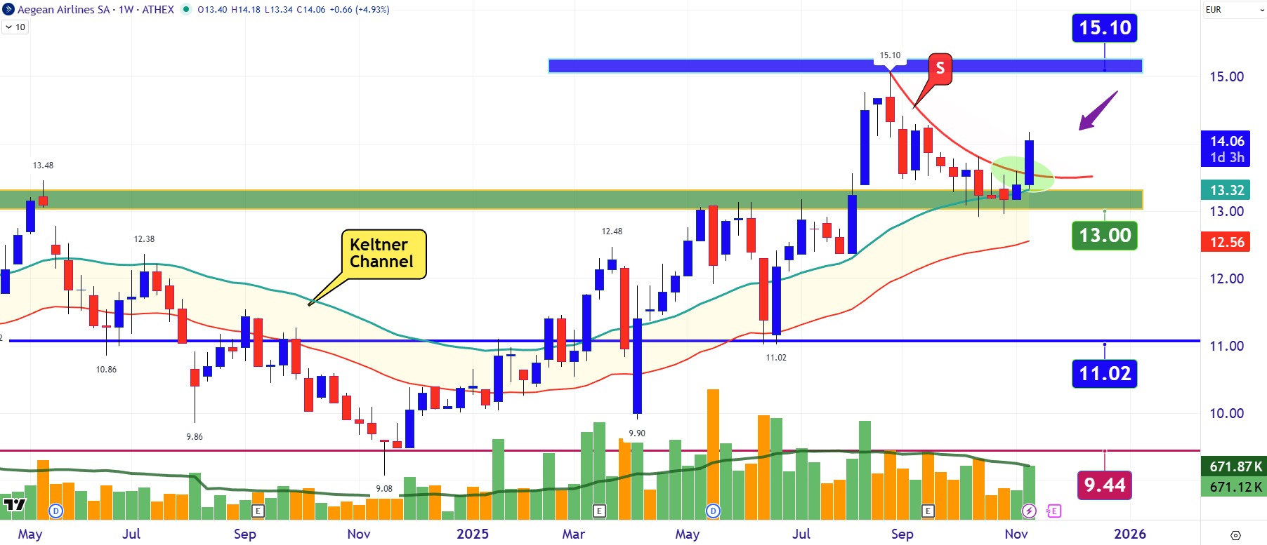 Εδώ διαγραμματικά η μετοχή δείχνει έπειτα από 84 μέρες να σπάει ανοδικά το καθοδικό στροφέα “S” στα 13,50 ευρώ ανοίγοντας το δρόμο για τη ζώνη των υψηλών ανάμεσα στα 14,80 με 15,10 ευρώ.