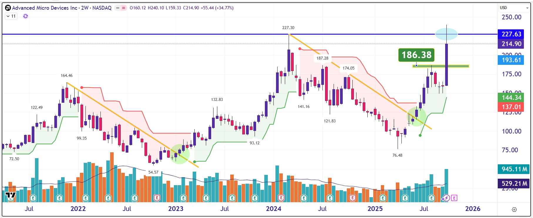Η μετοχή της AMD με την είδηση αυτή εκτινάχθηκε ένα +25% διαλύοντας στο διάβα της το προηγούμενο ιστορικό υψηλό που είχε σημειώσει στα 227,3 δολάρια το Φεβρουάριο του 2024. Τώρα βρίσκεται στα 214 δολάρια πραγματοποιώντας ένα βραχυχρόνιο κατέβασμα μετά την ανακοίνωση του Ντόναλντ για τους δασμούς στη Κίνα. Το διεβδομαδιαίο chart δείχνει συνέχεια ανόδου για την περιοχή των 250 με 260 δολαρίων αν η μετοχή δεν γράψει τιμές κάτω από το όριο των 186 δολαρίων.