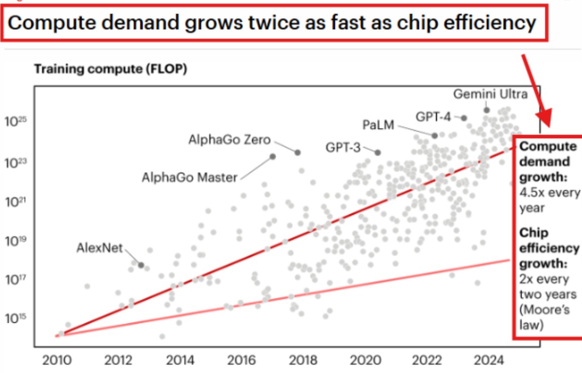 Η υπολογιστική ζήτηση του AI τρέχει πλέον δύο φορές πιο γρήγορα από τον ρυθμό που προβλέπει ο νόμος του Gordon Moore. Κάθε χρόνο, η ανάγκη για compute εκτοξεύεται 4,5 φορές, προκαλώντας ένα παγκόσμιο “shortage” ισχύος και επενδύσεων χωρίς ιστορικό προηγούμενο.