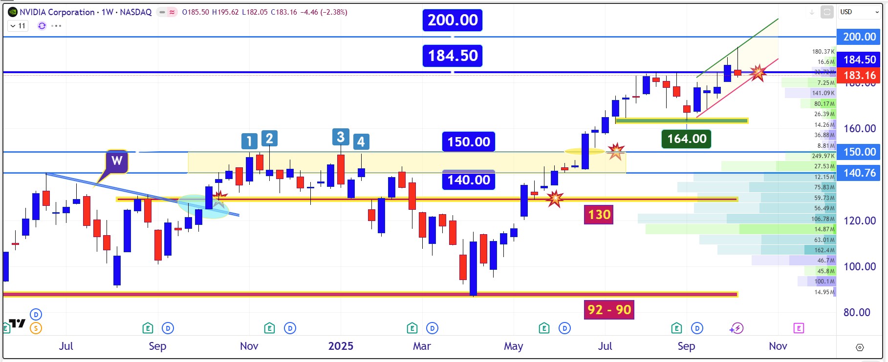 Στο εβδομαδιαίο τώρα διάγραμμα τιμών της Nvidia εύκολα μπορεί να καταλάβει κανείς ότι η μετοχή μετά την ανοδική διάλυση των προηγούμενων ιστορικών υψηλών στα 184,5 δολάρια έχει βάλει ως στόχο τη 200άρα.