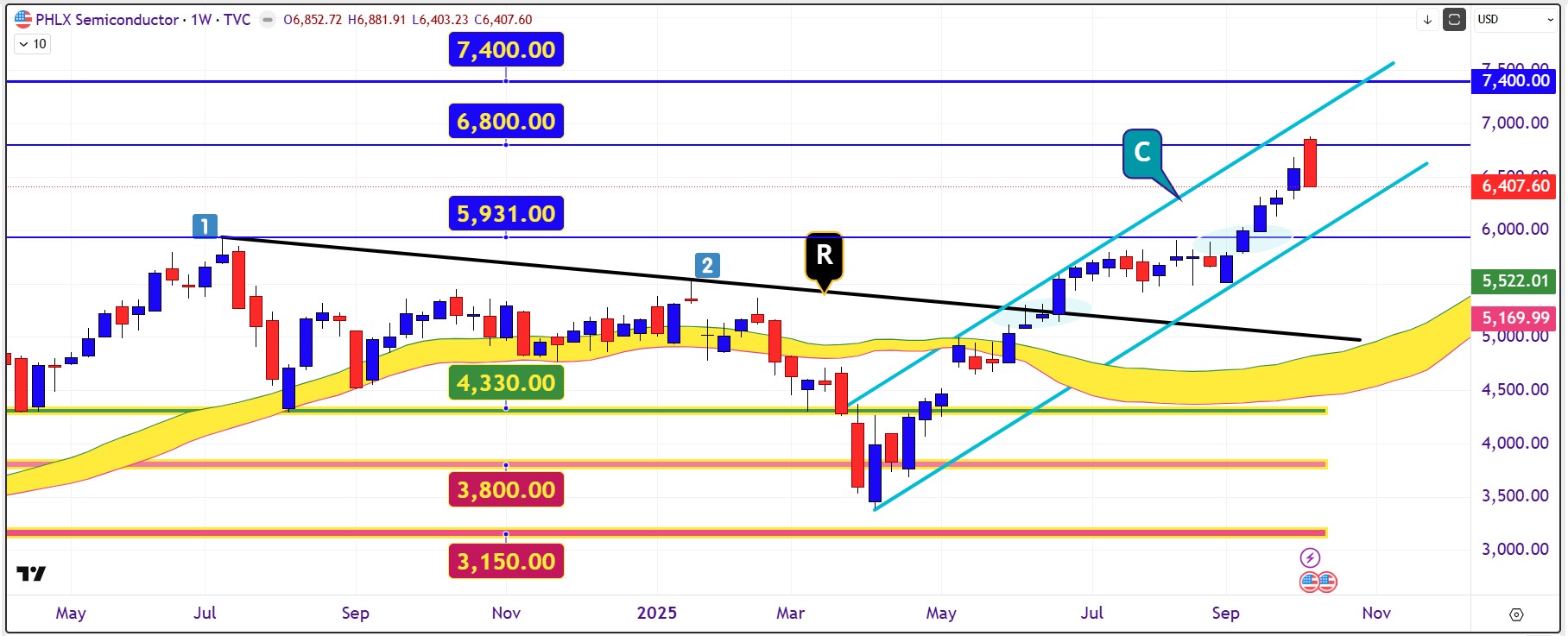 Από απόψεως διαγραμματικής ανάλυσης ο SOX αποτυπώνεται να δοκιμάζει την αντίσταση των 6.800 μονάδων καταγράφοντας νέο ιστορικό υψηλό, στις 6.882 μονάδες, κινούμενος μέσα στο μακροπρόθεσμο ανοδικό κανάλι “C” που δημιουργήθηκε τον περασμένο Απρίλη.