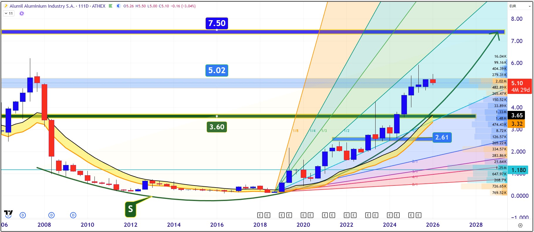 Στη μεγάλη εικόνα που δίνει η διαγραμματική ανάλυση στο chart ανά 111 μέρες είναι εμφανές ότι η μετοχή μετά τη σταθεροποίηση που πραγματοποιεί στη βάση των €5,02 με €4,90 ετοιμάζεται να εκτελέσει το επόμενο ανοδικό βήμα που οδηγεί στην περιοχή των 7,50 με 7,80 ευρώ.Μάλιστα υπό την πίεση του γιγάντιου ανοδικού στροφέα “S” η γωνία κλίσης τις ανόδου θα αρχίσει να παίρνει υψηλότερες τιμές.