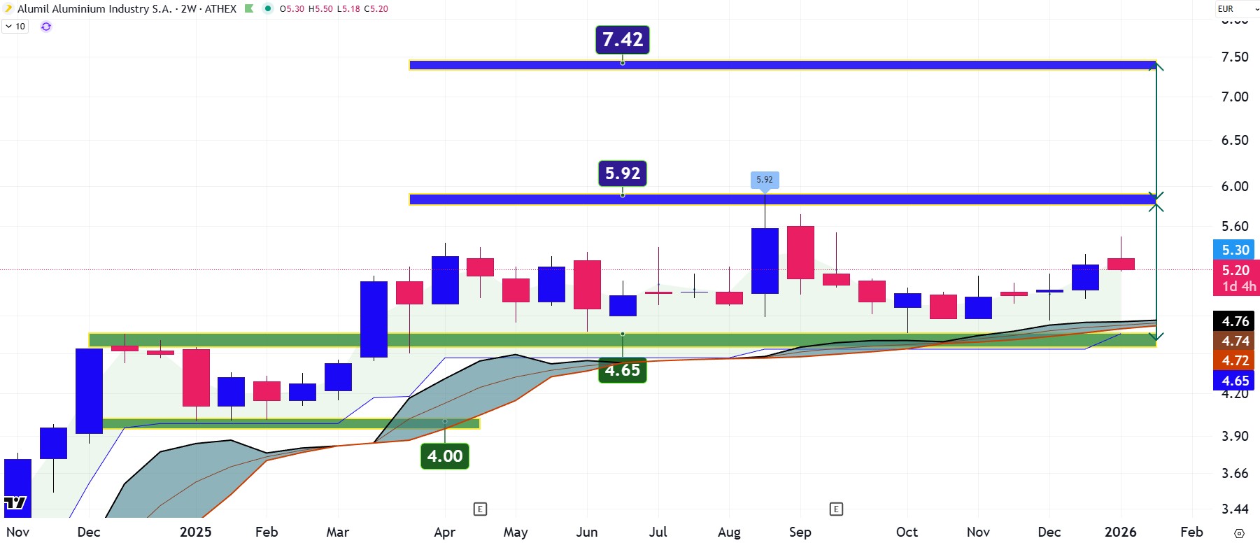 Σε περιβάλλον περιορισμένων ποσοτήτων και αυξημένου κόστους, οι εταιρείες με οργανωμένη παραγωγή και ευρύ δίκτυο πελατών αποκτούν ισχυρό πλεονέκτημα. Η Alumil ανήκει σε αυτή την κατηγορία, με τη θέση της να ενισχύεται διεθνώς όσο η αγορά αλουμινίου παραμένει σε υψηλές ζώνες. Στοιχείο το οποίο είναι ικανό να φέρει την τιμή της μετοχής, σύμφωνα με το διεβδομαδιαίο chart, στο επόμενο επίπεδο τιμών που ορίζεται ανάμεσα στα 6,50 με 7,42 ευρώ.