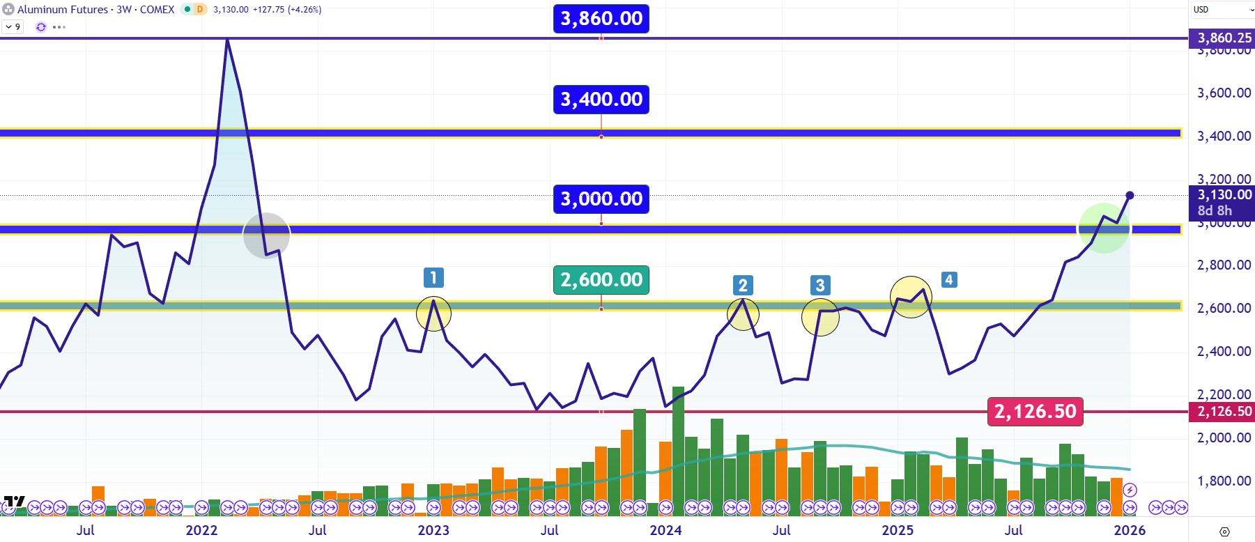 Η διεθνής αγορά αλουμινίου κινείται σε τιμές που ανεβάζουν αισθητά τον πήχη σε όλη την παραγωγική αλυσίδα. Το πρωτογενές μέταλλο διατηρείται πάνω από τα 3.100 δολάρια ανά τόνο, με πρόσφατη κορυφή στα 3.129 δολάρια και τις συναλλαγές να δείχνουν ότι αυτά τα επίπεδα δεν αποθαρρύνουν τους αγοραστές. Αντιθέτως, τους ανοίγουν τον δρόμο για υψηλότερες τιμές, προς το επίπεδο των 3.400 δολαρίων. Το τριεβδομαδιαίο διάγραμμα τιμών αποκαλύπτει ότι το αλουμίνιο έχει περάσει σε νέα ζώνη αποτίμησης, με τη δυναμική του να στηρίζεται ταυτόχρονα στο ενεργειακό κόστος, στα μεγάλα έργα υποδομών, στην ανάπτυξη που επιβάλλει η τεχνητή νοημοσύνη, στη βιομηχανία μεταφορών και αεροναυπηγικής, ενώ πλέον καθοριστικό ρόλο παίζει και η πράσινη ανακύκλωση μέσω των δευτερογενών κραμάτων.