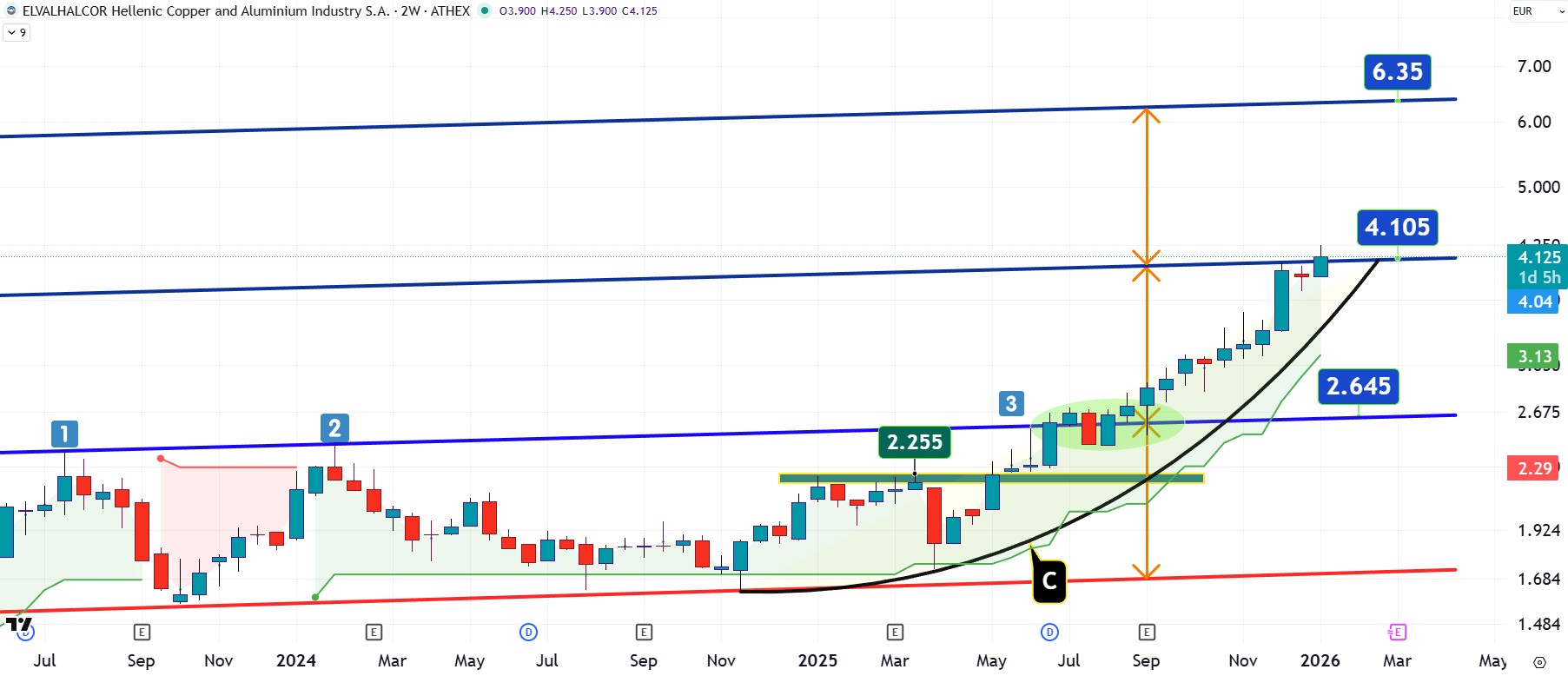 Σε μια αγορά όπου το κόστος ανεβαίνει πιο γρήγορα από τους όγκους, η ElvalHalcor βρίσκεται σε θέση να προστατεύσει περιθώρια και να ενισχύσει σημαντικά την αξία και το κέρδος της παραγωγής της. Εδώ, διαγραμματικά, η μετοχή δείχνει σημάδια κατάκτησης του επιπέδου των 4,10 με 3,84 ευρώ, ανοίγοντας τον μακροπρόθεσμο ανοδικό δρόμο για την περιοχή των 5,75 με 6,35 ευρώ.
