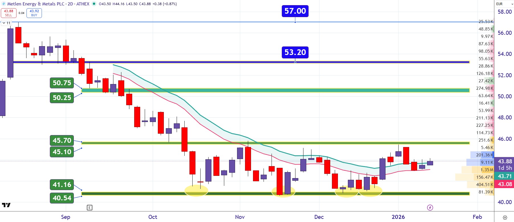 Επιπλέον, η διεθνής αναφορά τιμών ευνοεί παραγωγούς με γεωγραφική θέση και ποιότητα μετάλλου που απευθύνονται σε απαιτητικούς βιομηχανικούς πελάτες. Σε περιβάλλον όπου το κόστος ανεβαίνει σε όλη την αλυσίδα, η Metlen διατηρεί καθαρό πλεονέκτημα, προσδίδοντας ακόμα έναν λόγο στην τιμή της μετοχής να περάσει διαγραμματικά πάνω από τα 46 ευρώ και να κινηθεί προς τα 50,75 με 53,20 ευρώ.