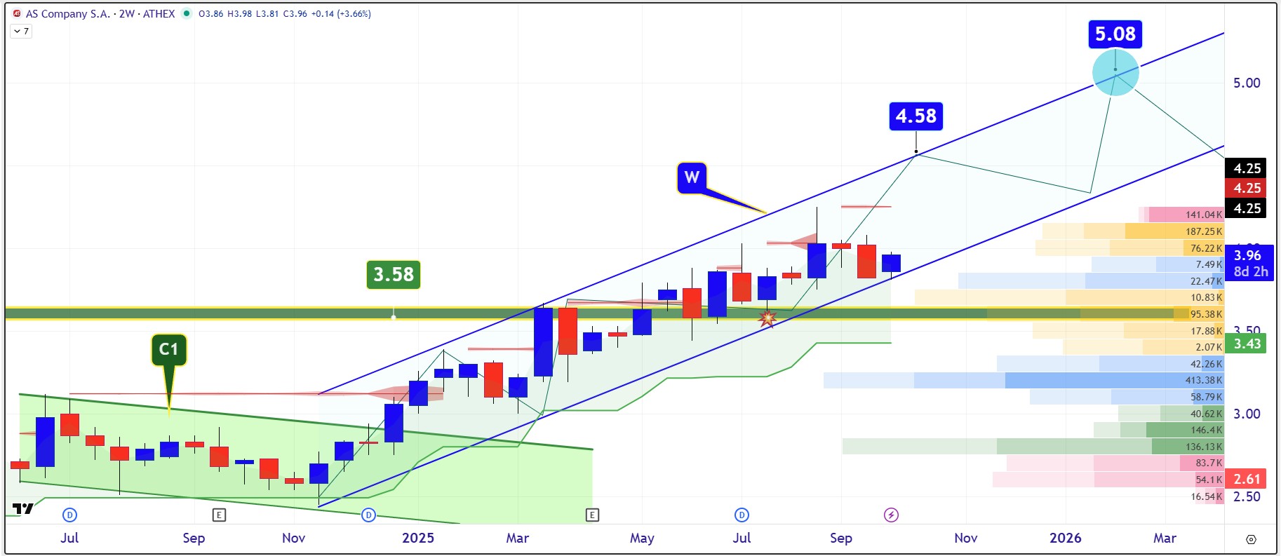 Στη διαγραμματική ανάλυση η μετοχή φαίνεται να πατάει στο κάτω μέρος του μακροπρόθεσμου ανοδικού καναλιού “W” και να ετοιμάζεται να συνεχίσει την πορεία της προς την περιοχή από όπου διέρχεται η άνω πλευρά στα €4,30 με €4,58. Η μετοχή πάντως σε αυτά τα επίπεδα τιμών δίνει πρόσβαση σε έναν όμιλο που αναπτύσσεται σταθερά, έχει προοπτική επέκτασης στο εξωτερικό και παράλληλα διαθέτει τα κεφάλαια να ανταμείψει έμπρακτα τους μετόχους του.
