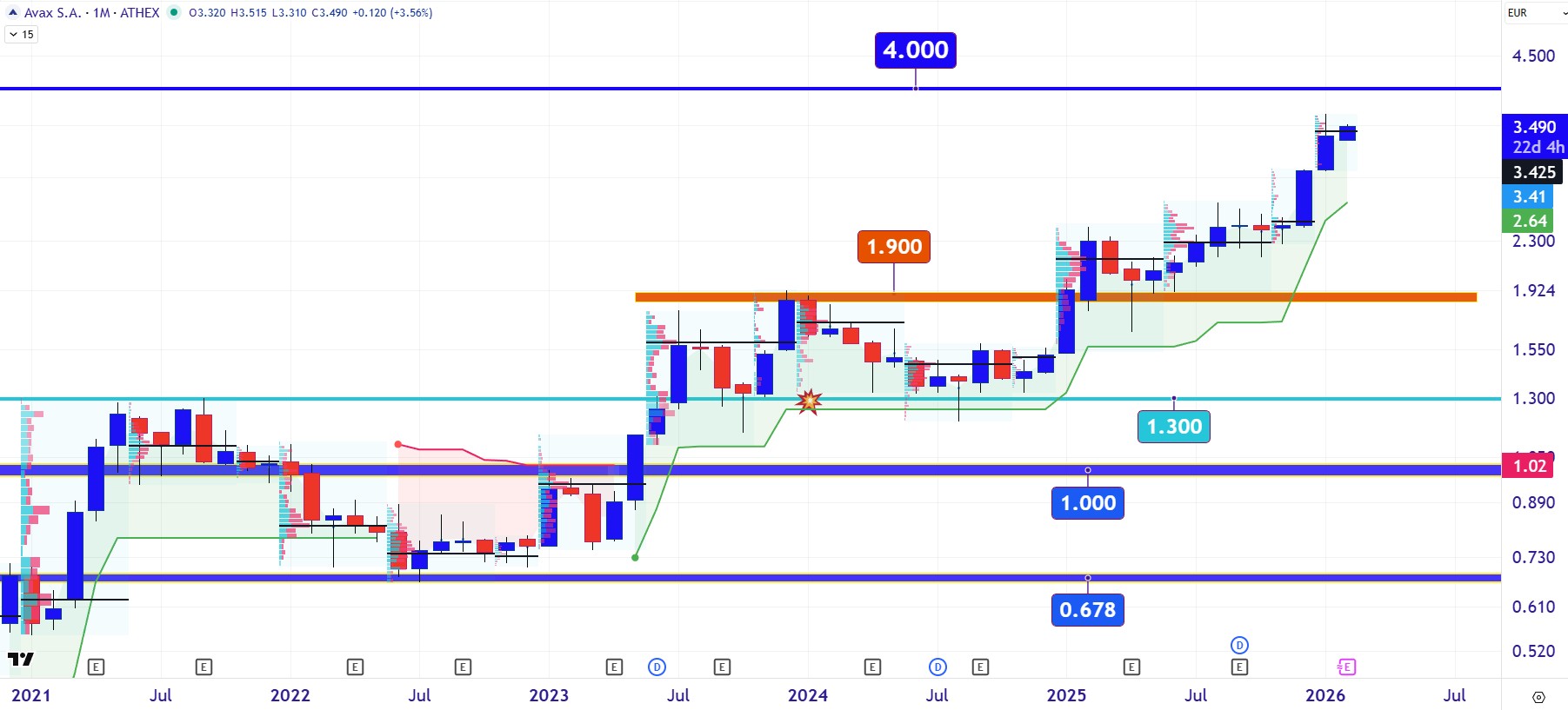 Εδώ η μετοχή στο μηνιαίο chart εμφανίζεται να διαμορφώνει μια αγοραστική βάση στα 3,20 με 3,00 ευρώ, ώστε να απλωθεί ανοδικά προς τα 4 ευρώ.