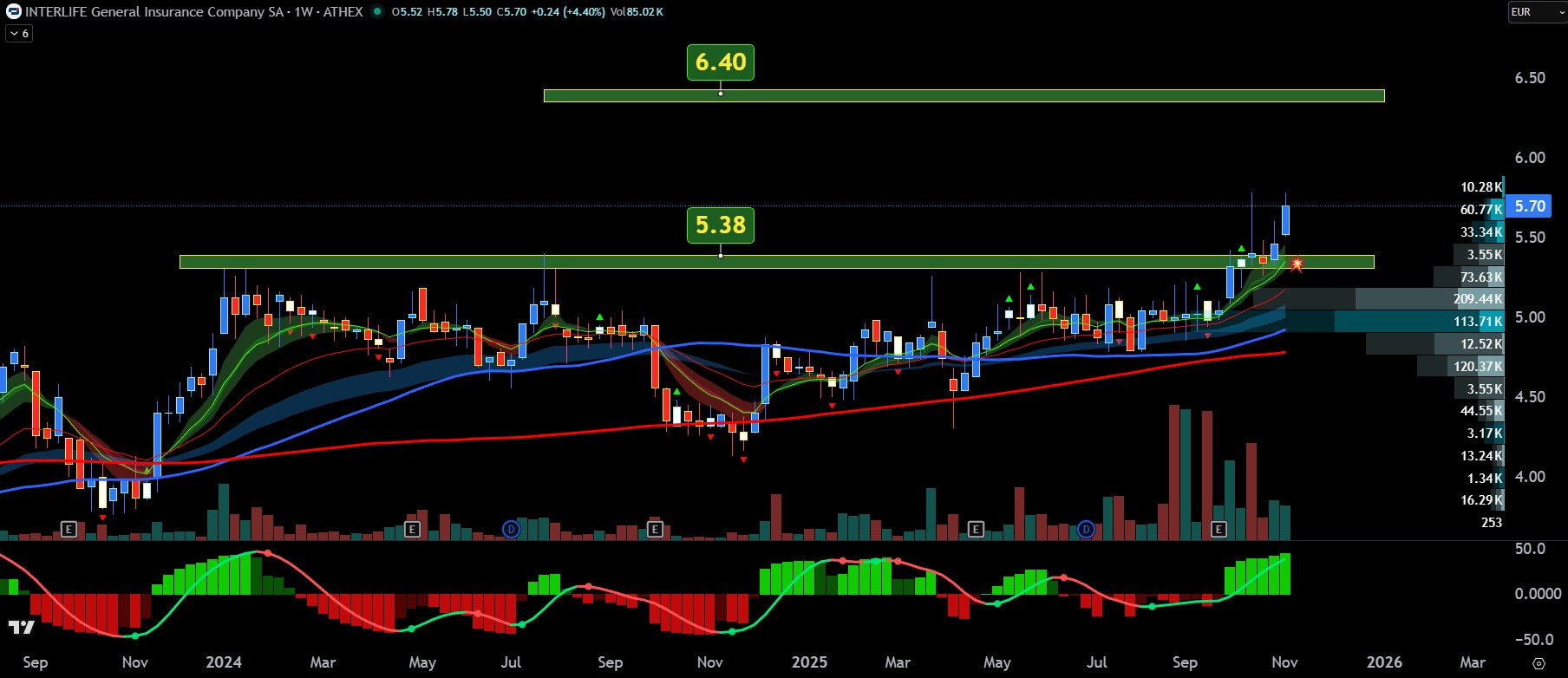 Από απόψεως τώρα διαγραμματικής ανάλυσης η μετοχή φαίνεται στο εβδομαδιαίο chart τιμών να έχει διαλύσει τη μακροχρόνια αντίσταση στα €5,38 και να έχει πάρει τον ανηφορικό δρόμο για το επίπεδο των €6,40 με €6,60.