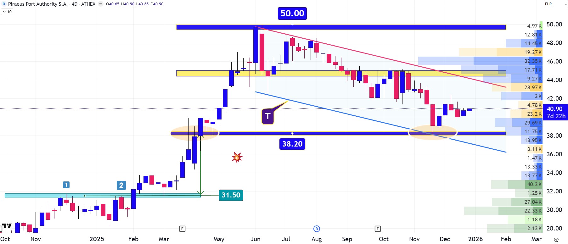Η μετοχή του ΟΛΠ τώρα δείχνει ότι κάπου εδώ τελειώνει το διορθωτικό κύμα της μεγάλης ανοδικής κίνησης από τα 19,62 ευρώ (Οκτ. 2023) έως τα 49,70 ευρώ (Ιουν. 2025). Σημείο-κλειδί για μια εκ νέου κίνηση προς τα 50 ευρώ, η ανοδική διάσπαση του καναλιού “T” στα 43,50 ευρώ.