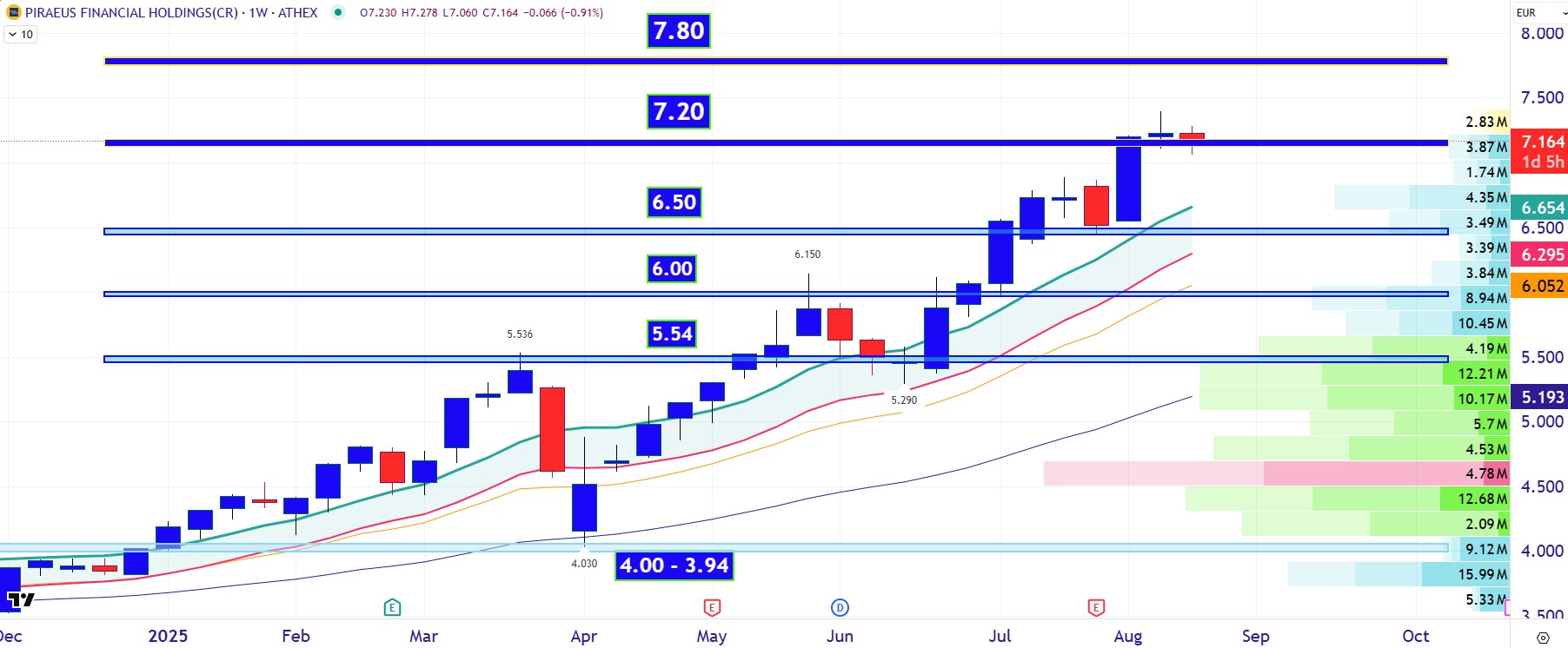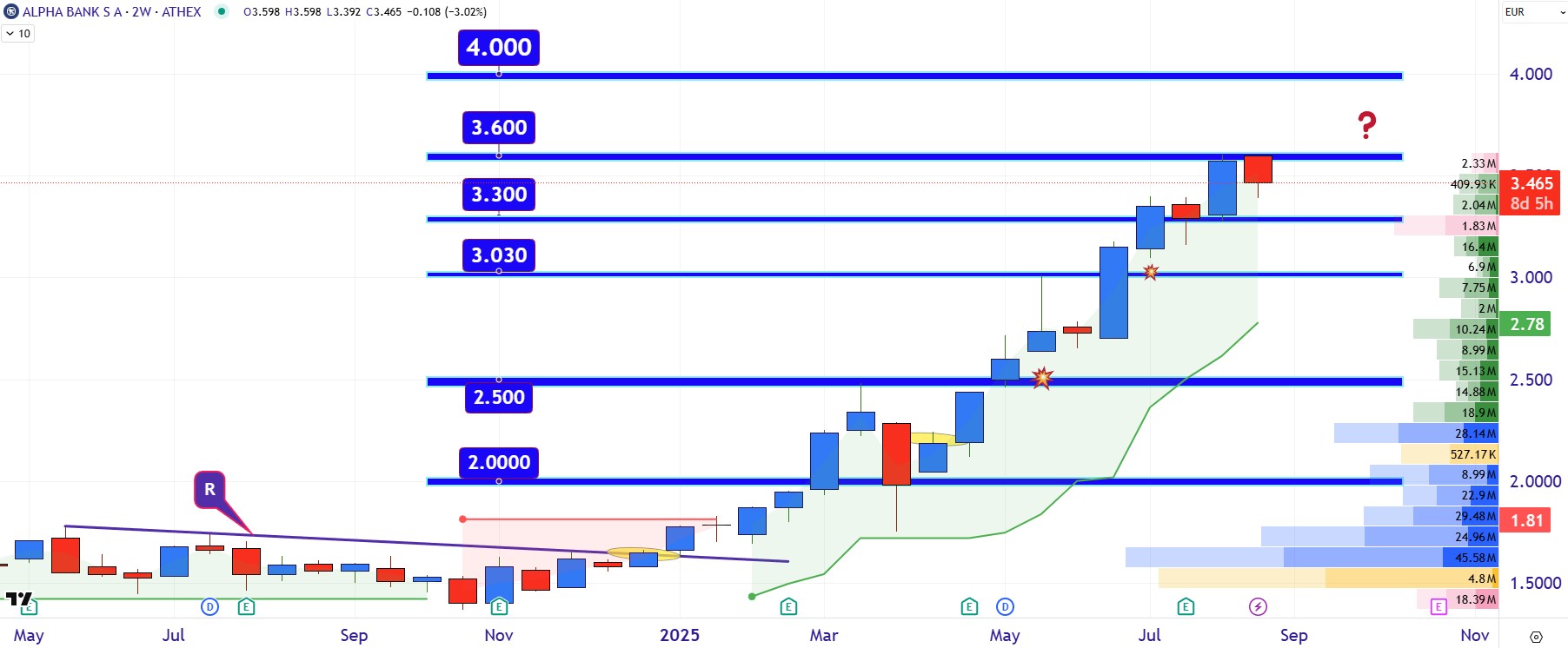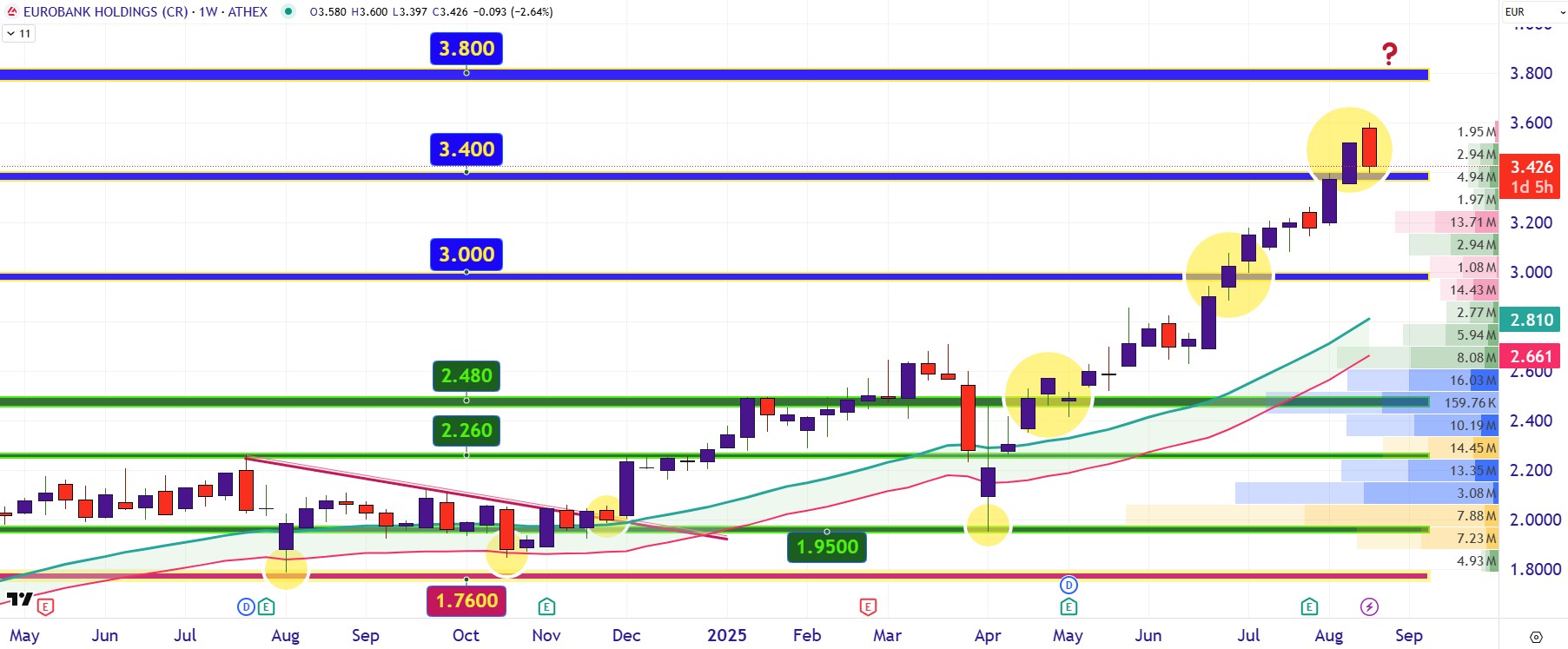 Σε όρους αποτίμησης, η Eurobank εμφανίζει από τους καλύτερους δείκτες στην Ευρώπη: P/E 2026 στις 8 φορές, με RoTE 16,2% και CET1 15,7%, επιδόσεις που δείχνουν την ανθεκτικότητα του ισολογισμού και τη δύναμη στη δημιουργία κεφαλαίου. Διαγραμματικά, η μετοχή έχει διασπάσει ανοδικά την περιοχή αντίστασης των 3,40 ευρώ και αρχίζει και κοιτά στο βάθος τη ζώνη των 3,80 με 4 ευρώ. Αλλαγή σκηνικού και βραχυχρόνιας τάσης με την καθοδική τμήση των 3,20 ευρώ.