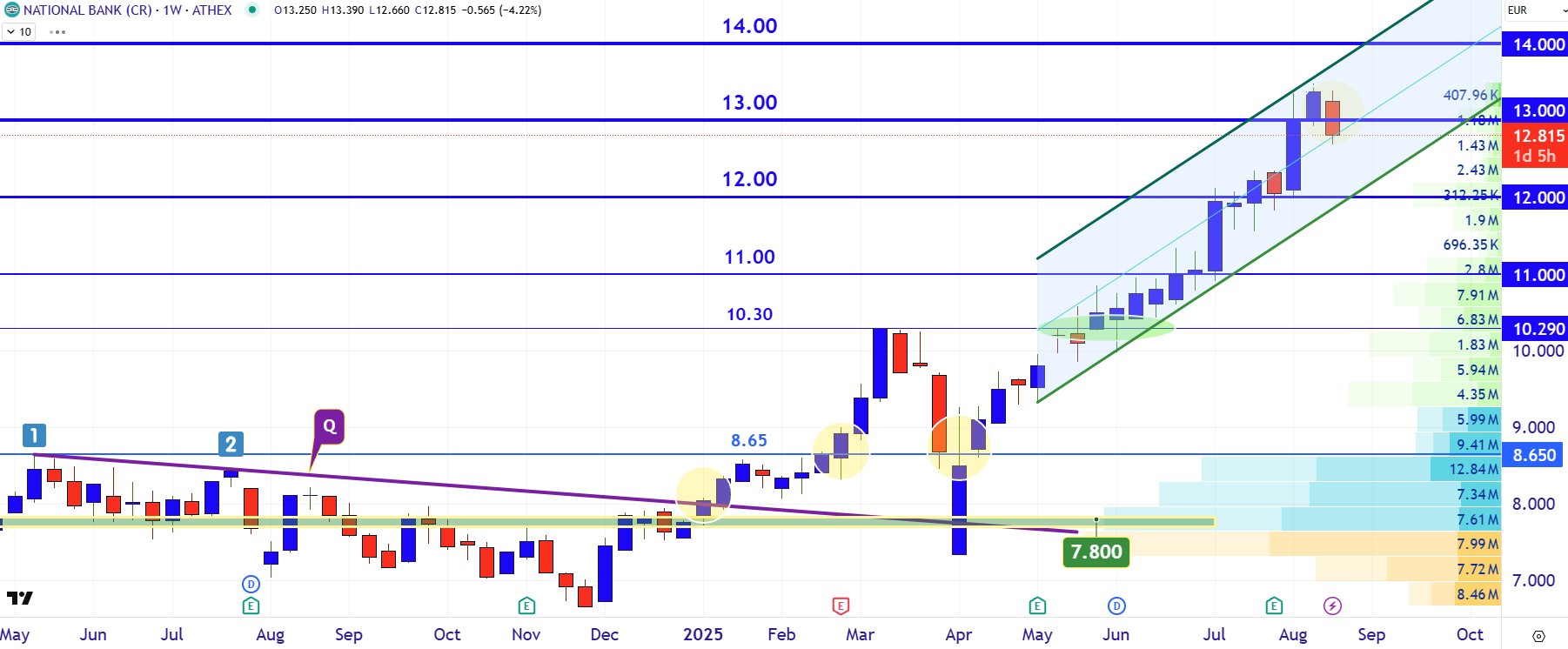 Στρατηγικά, η Εθνική διαθέτει ισχυρό κεφαλαιακό “μαξιλάρι” με CET1 στο 18,5%, αλλά εγείρονται ερωτήματα για την αξιοποίησή του, δεδομένης της περιορισμένης ορατότητας σε M&A (Συγχωνεύσεις και Εξαγορές). Από τεχνικής απόψεως η μετοχή, ενώ είχε πάρει ανοδικά το προπύργιο των 13 ευρώ, φτάνοντας έως τα 13,48 ευρώ, στη συνέχεια το έχασε. Όσο λοιπόν δεν βλέπουμε πατήματα πάνω από τα 13 ευρώ, τόσο θα ενισχύεται το βραχυχρόνιο σενάριο ενός pullback προς τα 12 με 11,80 ευρώ.