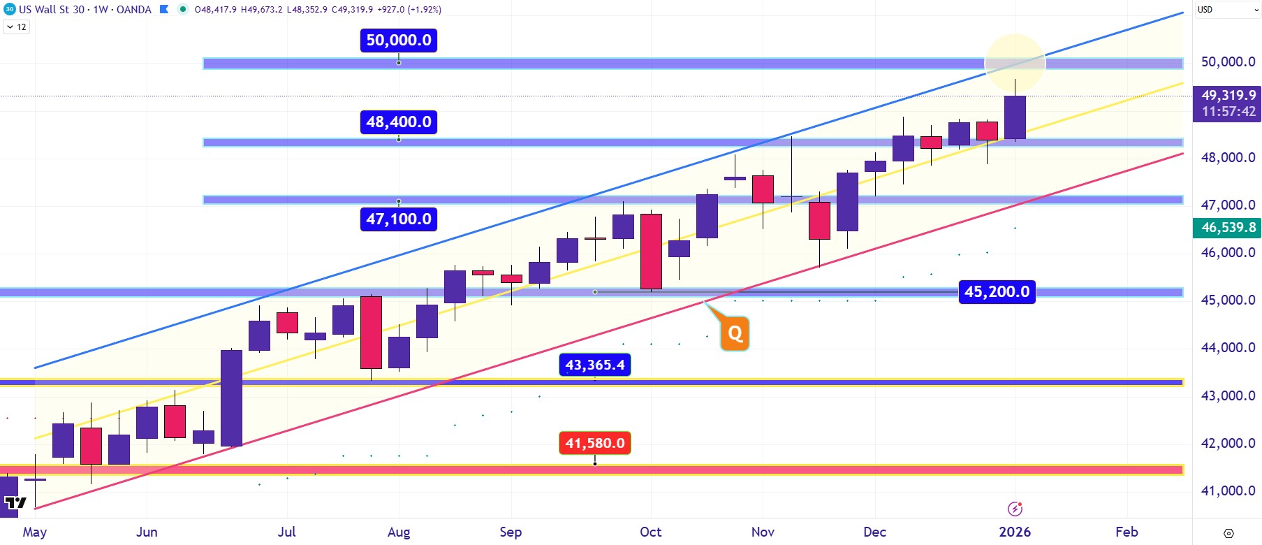 Ο δείκτης Dow Jones κινήθηκε τις τελευταίες εβδομάδες με έναν ελεγχόμενο ανοδικό βηματισμό, φτάνοντας σε απόσταση μόλις 320 μονάδων από το ψυχολογικό όριο των 50.000 μονάδων.