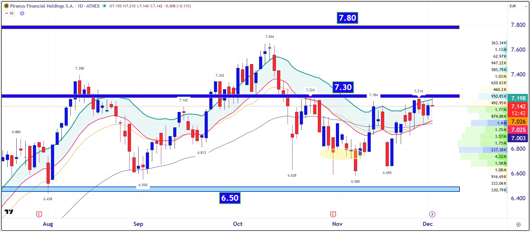 Στις επιθυμητές τιμές αξιολόγησης της BofA οι τράπεζες εξακολουθούν να διαπραγματεύονται κάτω από την εγγενή αξία τους. Η Eurobank δίνεται στα €4,86 με αλλαγή θεμελίων από τη Eurolife, την Κύπρο και τη Βουλγαρία. Η Πειραιώς αναβαθμίζεται στα €8,85 καθώς η εξαγορά της Εθνικής Ασφαλιστικής προσθέτει ένα νέο “όροφο” σε προμήθειες και cross-selling. Η Alpha ανεβαίνει στα €4,12 με βάση συντηρητικό ROTE 13,5% και ισχυρό κεφαλαιακό buffer. Η ΕΤΕ αξιολογείται στα €13,88, με τη BofA να διατηρεί ουδέτερη στάση τονίζοντας όμως ότι η τράπεζα έχει μπροστά της ισχυρό καταλύτη μετασχηματισμού.