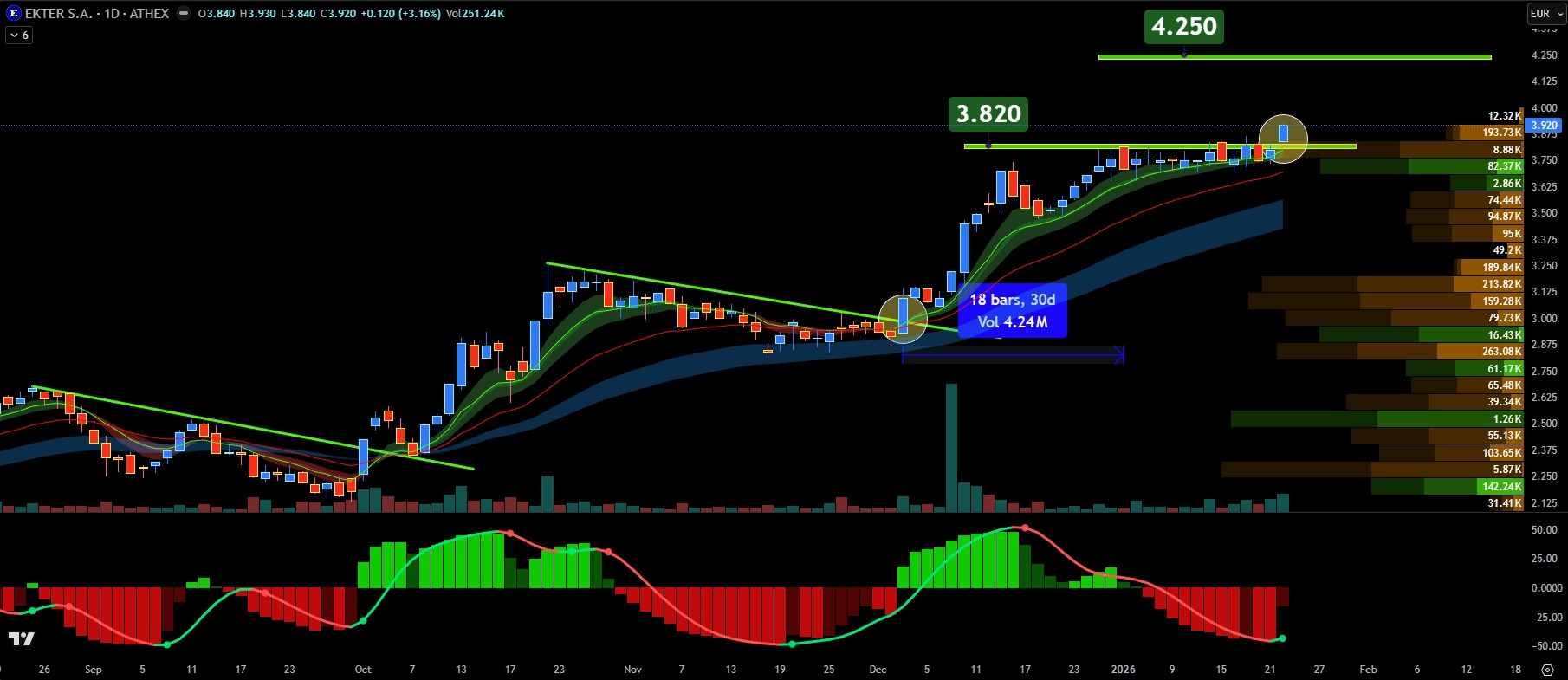 Διαγραμματικά η μετοχή δείχνει στο ημερήσιο chart τιμών να έχει διασπάσει ανοδικά την περιοχή αντίστασης των 3,76 με 3,82 ευρώ και να ανοίγει πλέον το έδαφος για ένα άπλωμα πρός το επίπεδο των 4,25 ευρώ. Ο αργός παραμετροποιημένος oscillator του Τ3 moving average εμφανίζεται να δίνει μόλις τώρα την απαρχή της επόμενης ανοδικής κίνησης η οποία μπορεί να έχει χρονική διάρκεια από 16 έως και 22 συνεδριάσεις.