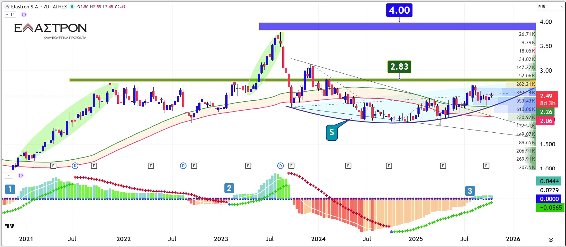 Τις δύο τελευταίες φορές που είχαμε κάτι παρόμοιο η μετοχή έδωσε με την ανοδό της αποδόσεις της τάξης του +130% το 2021 και +42% το 2023. Σημείο κλειδί είναι τα €2,83. Επιβεβαιωμένη ανοδική διάσπαση θα ανοίξει το έδαφος για τη ζώνη των €3,80 με €4,00.