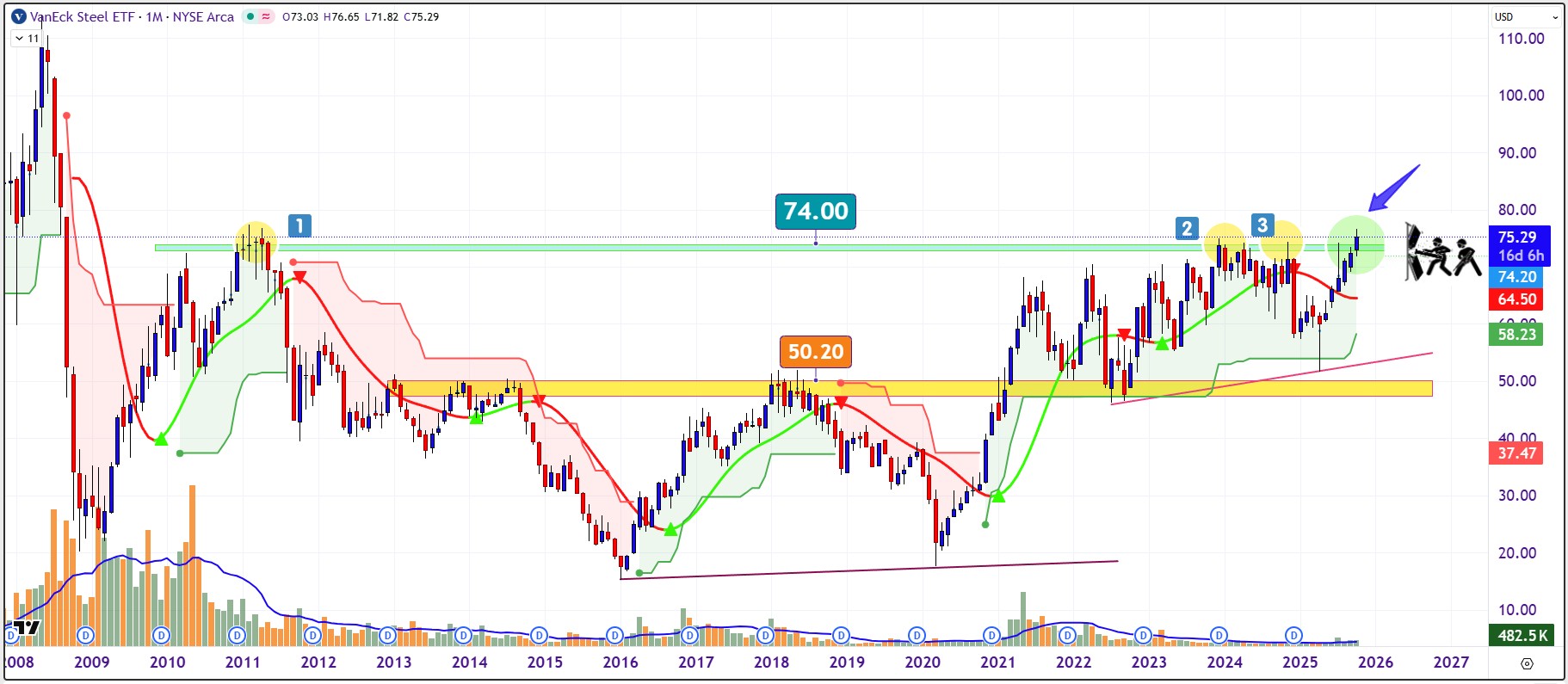 3. Η ώρα του χάλυβα: Η διεθνής αγορά στέλνει τα δικά της μηνύματα και, όπως όλα δείχνουν, η “ώρα του χάλυβα” πλησιάζει. Το VanEck Steel ETF (SLX), ο δείκτης–οδηγός του παγκόσμιου κλάδου, δείχνει στο μηνιαίο chart να ετοιμάζεται για ανοδική διάσπαση της 15ετούς αντίστασης, ένα τεχνικό γεγονός που θα σηματοδοτήσει την έναρξη ενός νέου ανοδικού κύκλου στις τιμές και στα περιθώρια των χαλυβουργιών. Σε αυτό το διεθνές momentum, η ΕΛΑΣΤΡΟΝ βρίσκεται σε προνομιακή θέση. Ο όμιλος, με μια καθαρή και πιο εξορθολογισμένη δομή κόστους, αποκτά την ευχέρεια να μεταφέρει ευκολότερα τις αυξήσεις τιμών στην αγορά, διατηρώντας ή και διευρύνοντας τα περιθώριά του. Με λίγα λόγια, η ΕΛΑΣΤΡΟΝ έχει όλα τα εφόδια να μετατρέψει το διεθνές breakout σε οικονομική επιτάχυνση, συνδέοντας τον εγχώριο μεταλλουργικό παλμό με την παγκόσμια αναθέρμανση του χάλυβα.