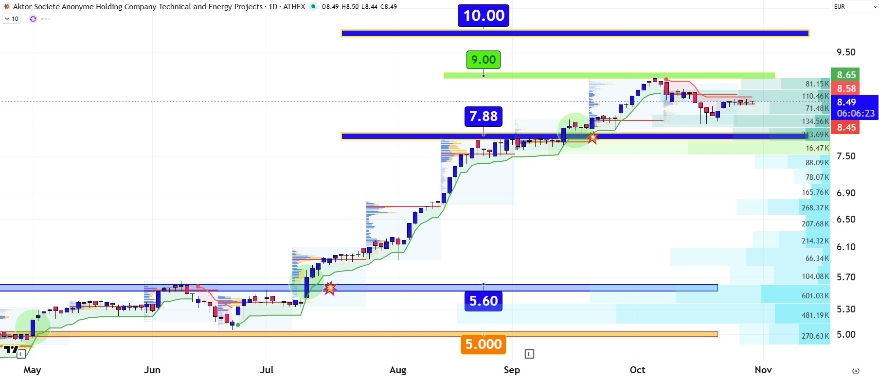 Η Aktor Group (AKTR), στο ίδιο χρονικό διάστημα που εξετάζουμε, έχει δώσει μια εκρηκτική άνοδο της τάξης του +62,14%. Εκεί μάλιστα που κάποιοι έβαζαν πωλήσεις στα 5 ευρώ “επειδή έτσι λέει το ρητό”, ο Αλέξανδρος Εξάρχου δεν θα χρειαζόταν να τους πει και πολλά για να το πετάξουν στον κάλαθο των αχρήστων και να γυρίσουν και πάλι αγοραστές. Ένα “θα σέβεσαι!” αρκούσε. Όχι σαν ένα επιτυχημένο σλόγκαν, αλλά σαν υπόσχεση πως ξέρει ακριβώς τι χτίζει. Και όταν ανακοινώθηκε η εξαγορά της Άκτωρ Παραχωρήσεις, δίνοντας EBITDA κερδοφορία 40 εκατ. ήδη από το 2025 και όχι από το 2030, που είχε τεθεί ο στόχος, και ταμειακές ροές 1,2 δισ. ευρώ, η υπόσχεση έγινε γραμμή έντονης ανόδου που έφερε τη μετοχή στα 9 ευρώ.