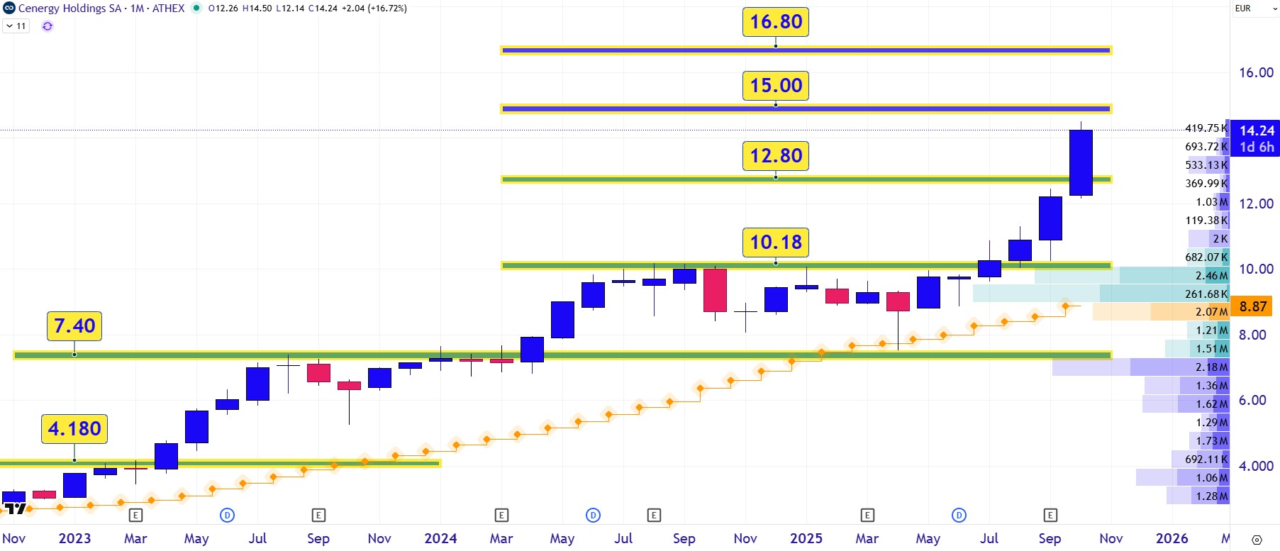 Κλείνω με τη Cenergy Holdings (CENER), που έχει δώσει κοντά +60%. Κάθε μήνας, δηλαδή, και δώρο σε όσους έμειναν στη μετοχή ένα +10%. Μα πραγματικά τώρα, είναι δυνατόν να δίνεις τον Μάιο το “θηρίο” πάνω στην ανάπτυξή του; Χαρακτηριστικό είναι το μακροπρόθεσμο διάγραμμα, στο οποίο, μετά την ανοδική διάλυση της περιοχής των 10,18 ευρώ, οι αγοραστές έχουν ξεχυθεί κατακτώντας τα 11,40, τα 12,80, τα 13,60 και τώρα πλησιάζουν στο κατώφλι των 15 ευρώ.