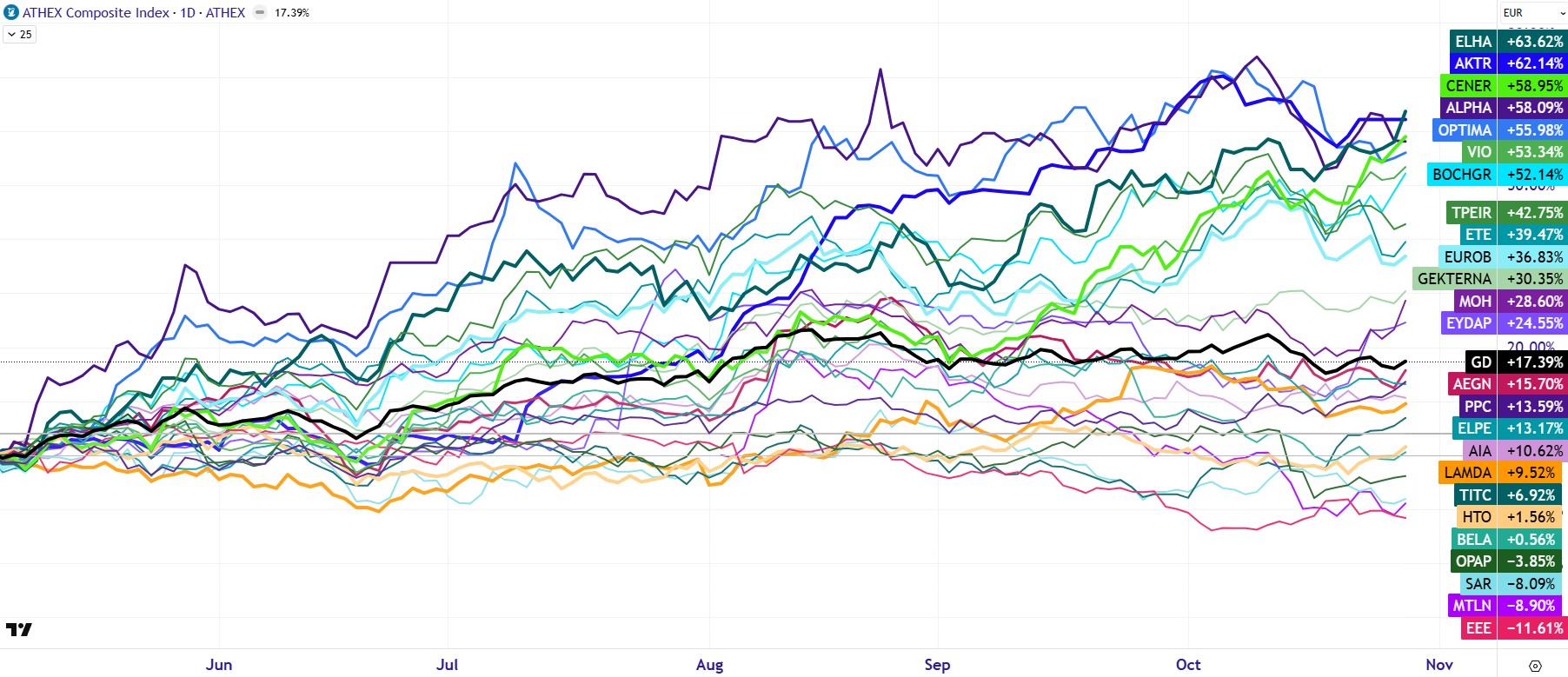 Τώρα που μπαίνει ο Νοέμβρης, οι “Μαϊάδες” που πούλησαν τότε κοιτάζουν το ταμπλό σαν τουρίστες χωρίς βαλίτσα. Θέλουν να ξαναμπούν, αλλά σχεδόν όλα είναι ακριβότερα. Και κάπως έτσι το “Sell in May” έγινε “Sell in May… και τώρα buy in pain”. Οπότε, για του χρόνου, κρατήστε ως σημείωση: στις αγορές δεν κερδίζει όποιος ξέρει παροιμίες – κερδίζει όποιος ξέρει να μένει. Και για όσους έμειναν ας ρίξουμε μια ματιά στις τρεις κορυφαίες σε απόδοση μετοχές που έγραψαν το εγχειρίδιο της φετινής ανόδου.