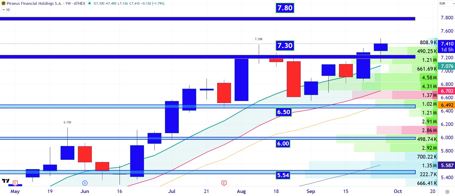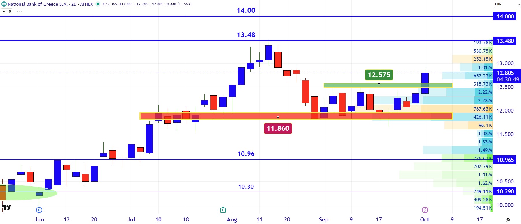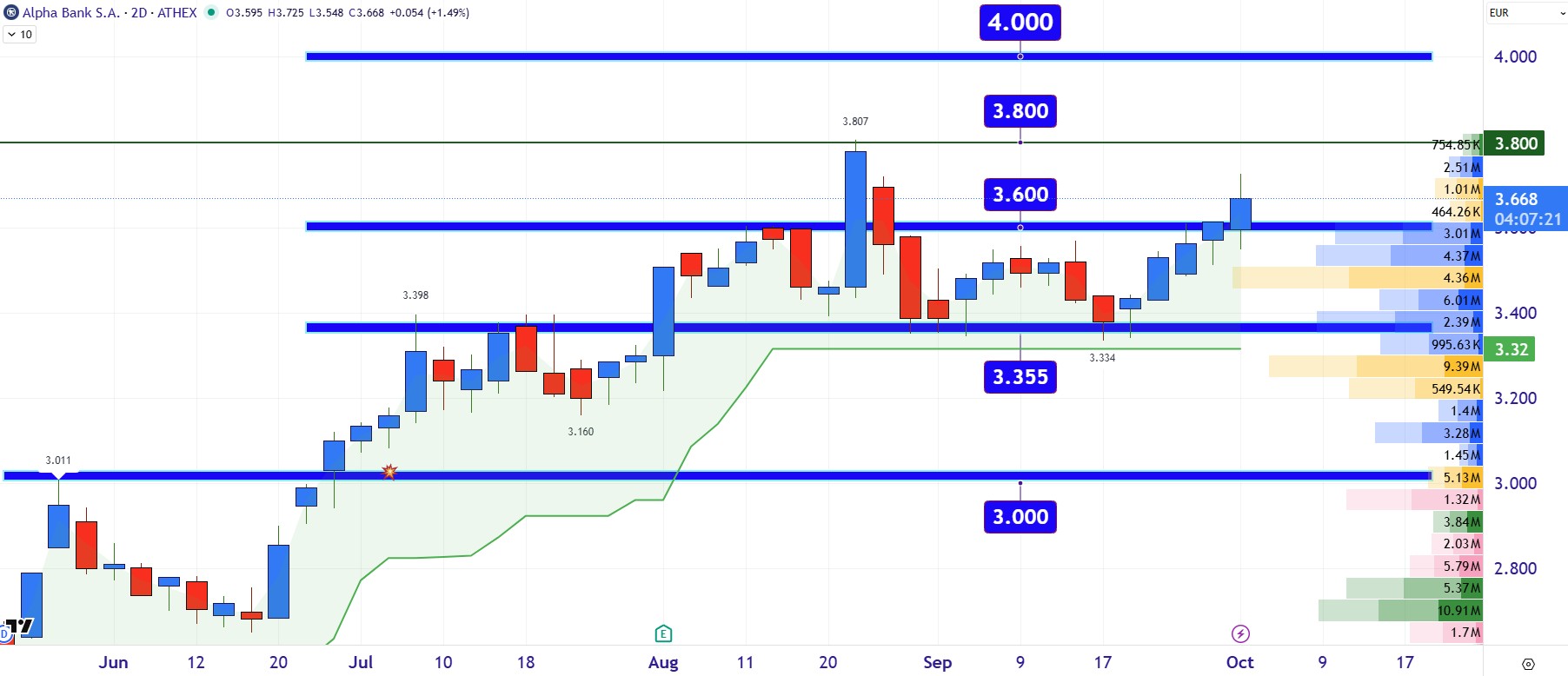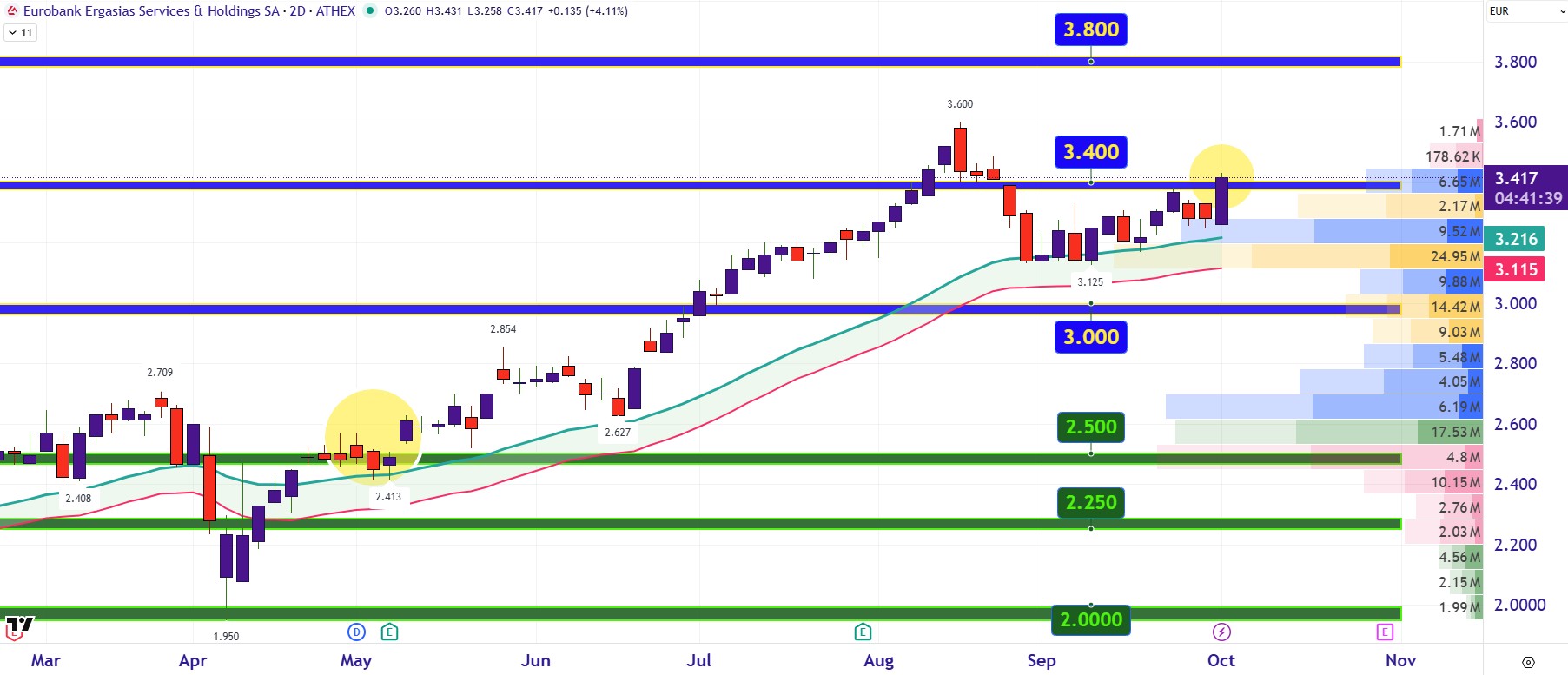 Από τις επιμέρους διαγραμματικές αναλύσεις η μετοχή της Eurobank αποτυπώνει μια επαναφορά πάνω από το κρίσιμο επίπεδο αντίστασης των 3,40 ευρώ, με αυξημένο όγκο συναλλαγών, στοιχείο που, αν επιβεβαιωθεί με ημερήσιο κλείσιμο, θα ενισχύσει το ανοδικό τασικό σήμα. Η ζώνη των 3,20 με 3,16 ευρώ λειτουργεί ως ισχυρή στήριξη, ενώ η επόμενη αντίσταση στην περίπτωση που η μετοχή αποδράσει από τα 3,40 είναι τα 3,80 ευρώ. Να σημειώσω εδώ ότι το προηγούμενο υψηλό που σημειώθηκε στα μέσα του περασμένου Αυγούστου ήταν στα 3,60 ευρώ.