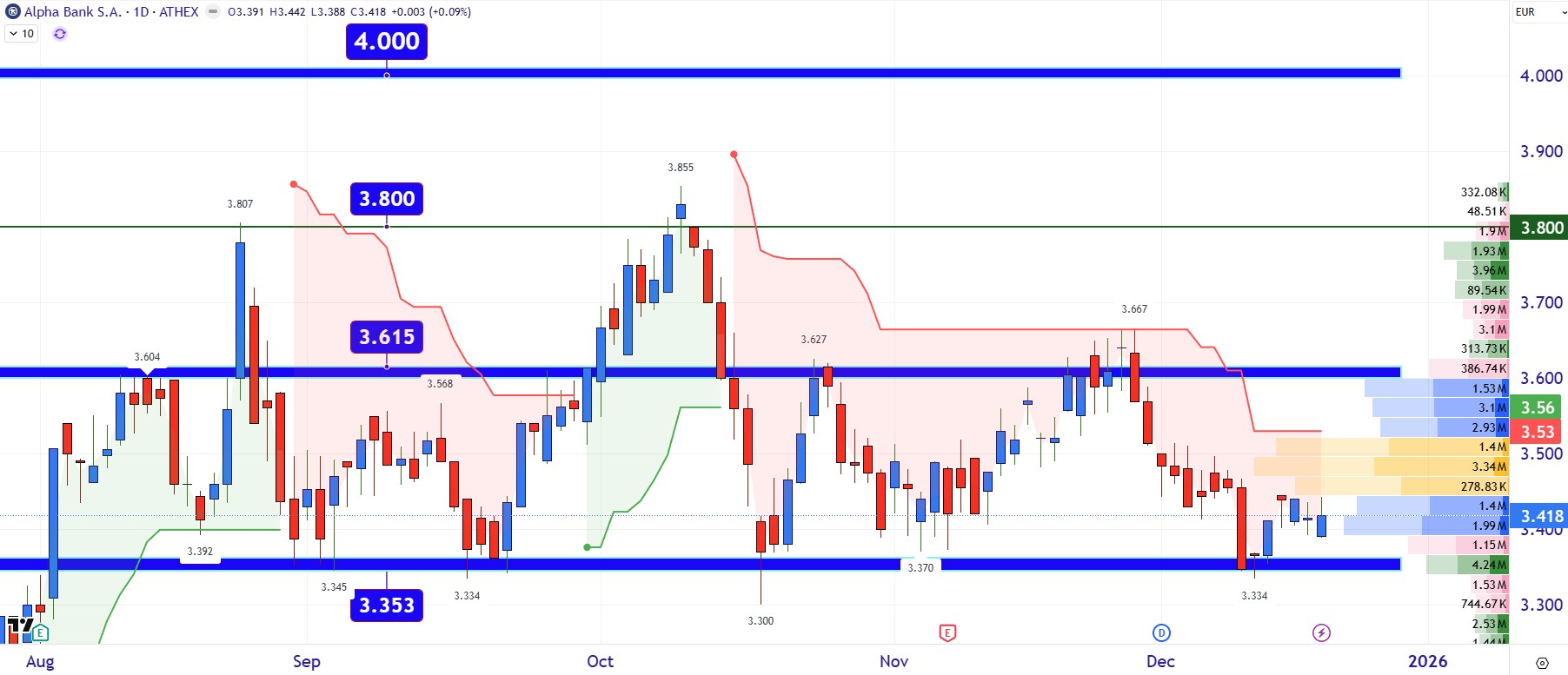 Ταυτόχρονα, η τράπεζα εισέρχεται στη νέα της εκατονταετία από θέση ισχύος. Ο μετασχηματισμός της, η ενισχυμένη κεφαλαιακή βάση και η στρατηγική συνεργασία με τη UniCredit εντάσσουν την Alpha Bank πιο δυναμικά στον ευρωπαϊκό τραπεζικό χάρτη. Η μετοχή της Alpha Bank διάγει μια από τις καλύτερες στην ιστορία της χρονιές καταγράφοντας από την αρχή του 2025 μια απίστευτη απόδοση της τάξης του +111%. Διαγραμματικά το πάτημα πάνω στα 3,40 με 3,34 ευρώ θα οδηγήσει εκ νέου πάνω από τα 3,60.