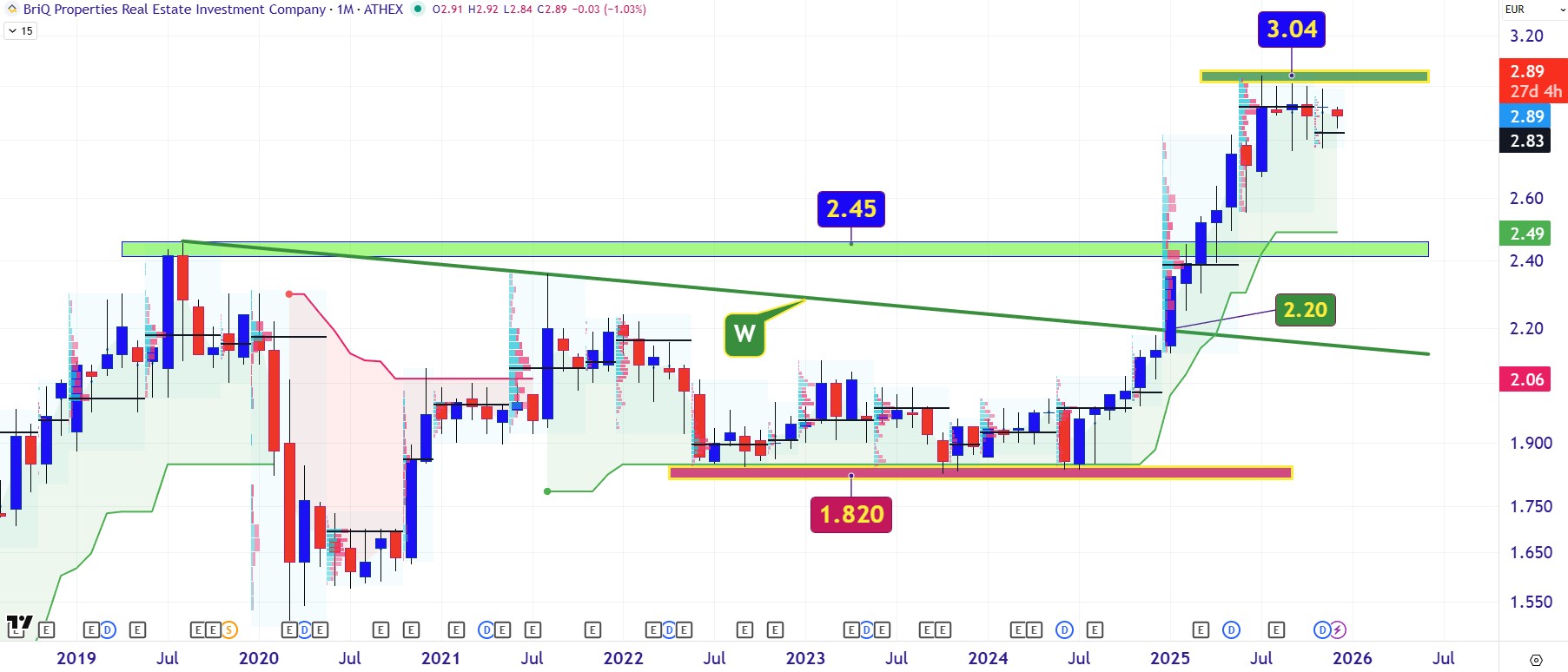 Η BriQ Properties, με τιμή 2,90 ευρώ και κεφαλαιοποίηση 136,73 εκατ. ευρώ, λειτουργεί με συνέπεια και μεθοδικότητα. Το χαρτοφυλάκιο έχει ενισχυθεί μετά τη συγχώνευση με την Intercontinental International, και τα μεγέθη δείχνουν σταθερή άνοδο: έσοδα με 2,4% CAGR, adj. EBITDA με 2,7% CAGR και ετήσιες αναπροσαρμογές αξιών γύρω στα 6,3 εκατ. ευρώ.