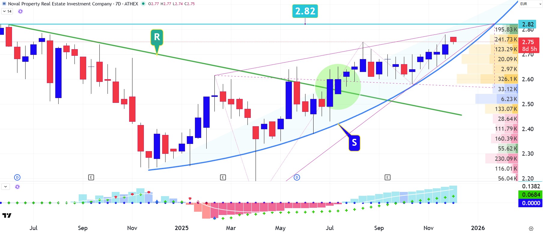Ξεκινάω με τη Noval Property, μια εταιρεία που έχει εισέλθει σε περίοδο έντονου επενδυτικού βηματισμού, με έργα που ενισχύουν σταθερά το εύρος και την ποιότητα του χαρτοφυλακίου της. Με τιμή στα 2,75 ευρώ και κεφαλαιοποίηση 347,69 εκατ. ευρώ, το ταμπλό δεν αντικατοπτρίζει τον ρυθμό με τον οποίο ανεβαίνουν τα θεμελιώδη μεγέθη.