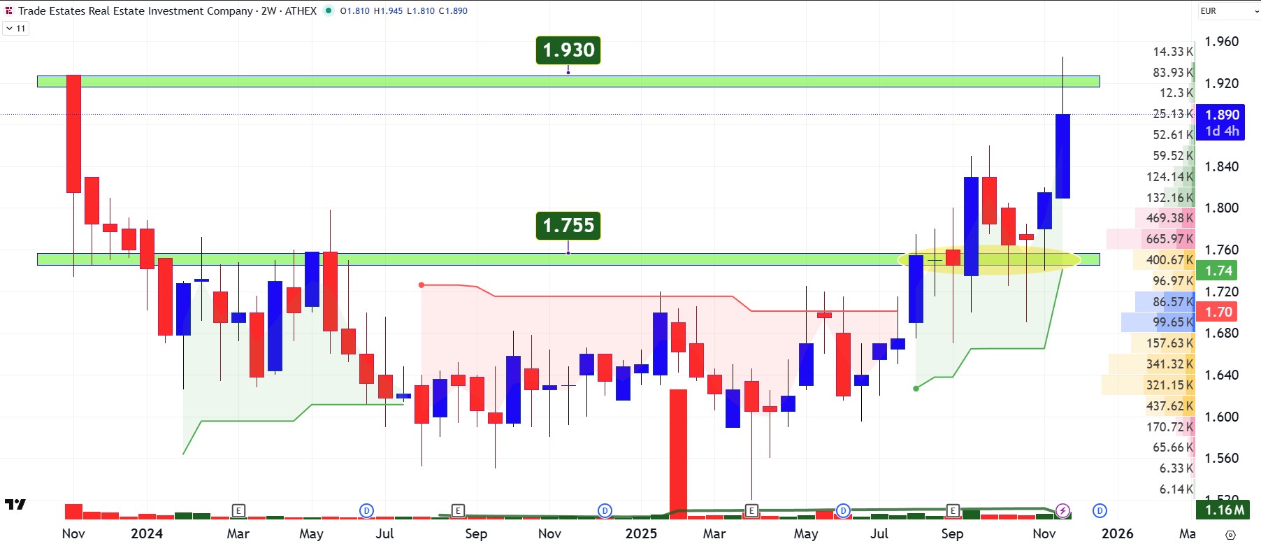 Η Trade Estates, στα 1,94 ευρώ και 233,8 εκατ. ευρώ σε κεφαλαιοποίηση, αποτελεί την ΑΕΕΑΠ που έχει διαμορφώσει την επενδυτική της ταυτότητα γύρω από retail parks και logistics, αξιοποιώντας τη σταθερή ζήτηση και τα υψηλά μισθωτικά προφίλ των συγκεκριμένων κατηγοριών.