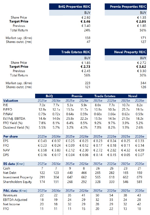 Σε αυτό το πλαίσιο, οι Noval Property, Premia Properties, Trade Estates και BriQ Properties ξεχωρίζουν για εντελώς διαφορετικούς λόγους. Η πρώτη, λόγω εύρους αναπτύξεων και ποιοτικών πιστοποιήσεων. Η δεύτερη, λόγω της επιθετικής ενίσχυσης του χαρτοφυλακίου της στους πιο αποδοτικούς τομείς. Η τρίτη, χάρη στη συγκέντρωση σε δύο asset classes που αποδίδουν σταθερά πάνω από τον μέσο όρο της αγοράς. Η τέταρτη, χάρη στη συνεπή διαχείριση και στην προσεκτική ανανέωση των περιουσιακών της στοιχείων. Η Alpha Finance με ωραίο τρόπο περνά σε προβολές, ποσοτικοποιεί ρυθμούς ανάπτυξης, ενσωματώνει ενοίκια, yields, revaluations και επιβεβαιώνει ότι οι προοπτικές των τεσσάρων εταιρειών δημιουργούν περιθώριο ισχυρής ανόδου.
