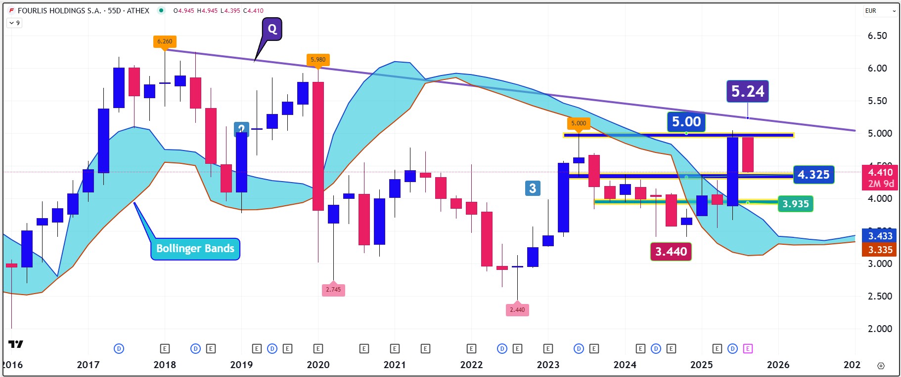 Από απόψεως διαγραμματικής ανάλυσης μεγάλο επενδυτικό ενδιαφέρον παρουσιάζει το pullback που πραγματοποιεί η μετοχή από τα €5,05 στην ισχυρή ζώνη στήριξης των €4,40 με €4,3. Η δημιουργία ενός “πατήματος” πάνω στις βιαστικές ρευστοποιήσεις του φευγαλέου πωλητή των τελευταίων συνεδριάσεων θα βάλει τη σφραγίδα για την επόμενη κίνηση που θα φέρει τη μετοχή πάνω από τα €5,24 και την μακροπρόθεσμη γραμμή πίεσης “Q” αλλάζοντας ριζικά την υπάρχουσα εικόνα της τελευταίας 8ετίας (!).