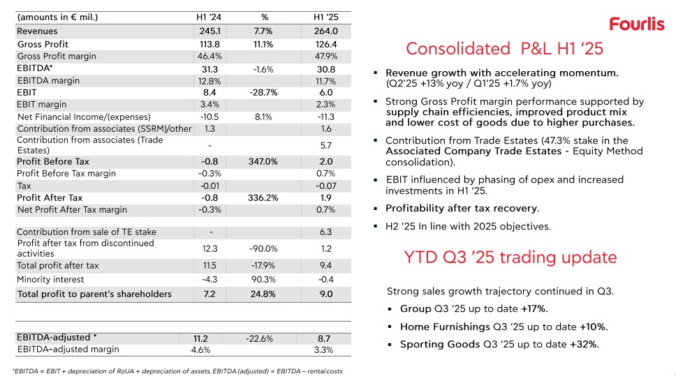 Ο όμιλος Fourlis (ΦΡΛΚ) ολοκλήρωσε το πρώτο εξάμηνο του 2025 με αποτελέσματα που δείχνουν ξεκάθαρα ότι η δυναμική ανάπτυξη δεν αποτελεί κάτι συγκυριακό αλλά μια καλοστημένη στρατηγική που αποδίδει καρπούς.