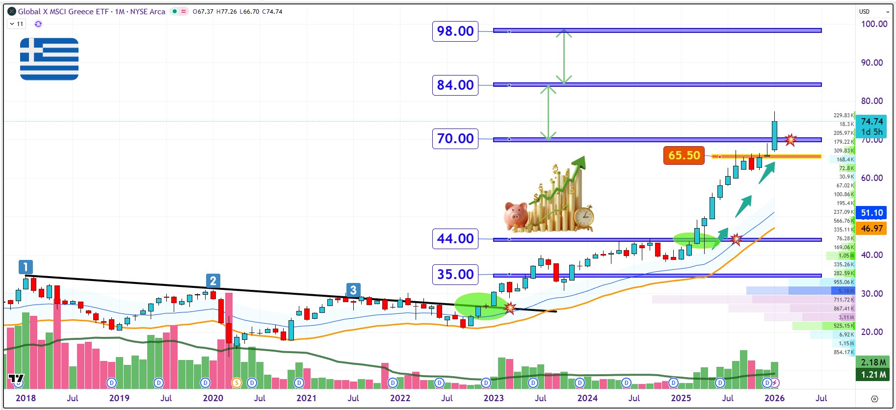 Το GREK από απόψεως κίνησης και διαγραμματικής ανάλυσης έχει φτάσει αυτή τη στιγμή σε νέο υψηλό 52 εβδομάδων, στα $77,20 (τώρα βρίσκεται στα $74,74), κινούμενο περίπου +90% πάνω από το 52-εβδομάδων χαμηλό των $39,58, κάτι που έχει τραβήξει την προσοχή ισχυρών επενδυτικών λογαριασμών στις ΗΠΑ . Τα γνωστά “βαθιά” επενδυτικά πορτοφόλια. Παράλληλα, έχουμε και τον τύπο με το μέρος μας, καθώς έχει υπάρξει ένας βομβαρδισμός δημοσιευμάτων που το ανέδειξαν ως ένα από τα πιο δυναμικά εντός των country ETFs του 2025, με πολύ ισχυρή ανοδική απόδοση σε σχέση με άλλα διεθνή προϊόντα. Και όχι φυσικά αδίκως.