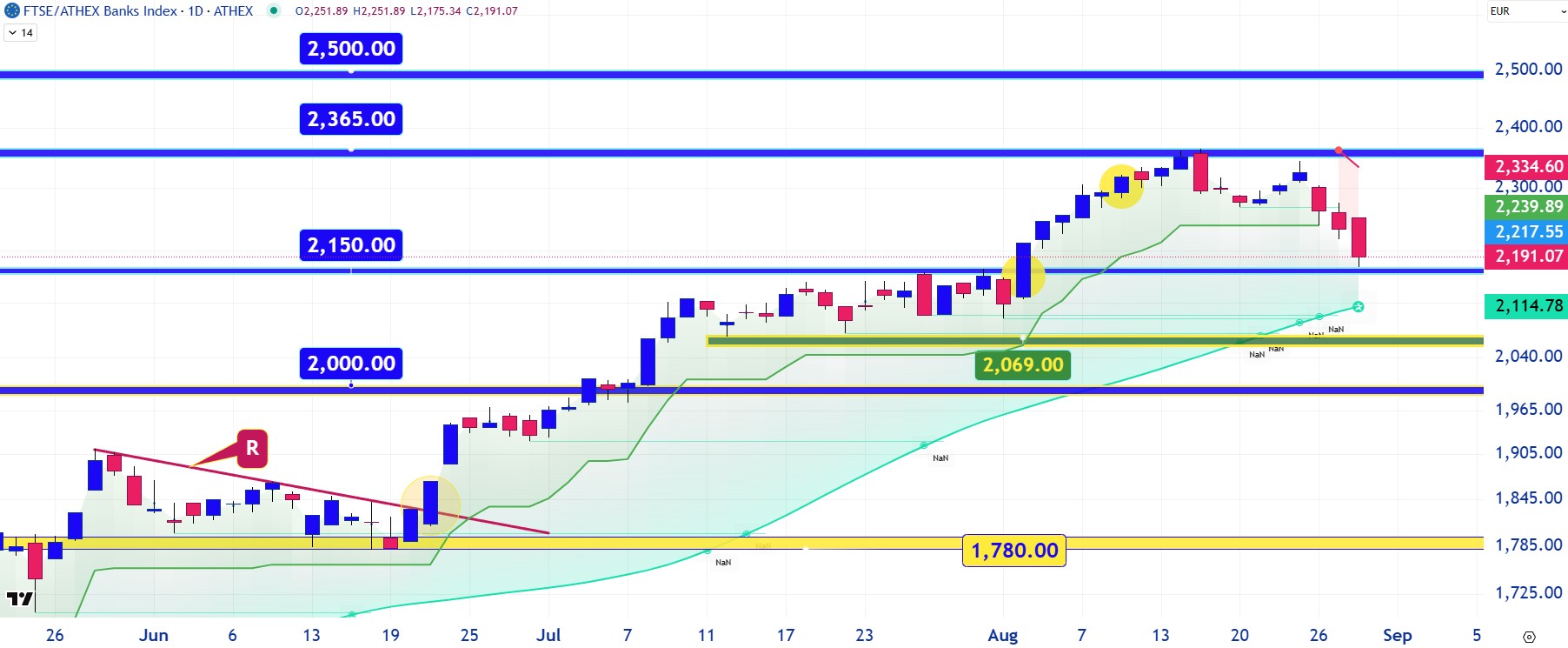 Προχωράμε στη διαγραμματική ανάλυση του Τραπεζικού Δείκτη, που έπειτα από μια άνοδο της τάξης του +32% από τα μέσα του περασμένου Ιουνίου αποφάσισε να κάνει ένα βραχυχρόνιο pullback προς ανάκτηση νέων δυνάμεων. Το πρώτο σημείο στήριξης συναντάται στις 2.150 μονάδες, ενώ το αμέσως και πλέον κρίσιμο εντοπίζεται στις 2.069 με 2.000 μονάδες. Περιοχή που δεν πρέπει να καταπατηθεί από τους πωλητές, καθώς θα τραβήξει λίγο πιο πίσω χρονικά το σενάριο ανοδικής διάλυσης της περιοχής των 2.500 μονάδων καταγράφοντας έτσι νέο ρεκόρ πολλών ετών. Εδώ τη μεγαλύτερη βαρύτητα με 27,5% την έχει η Εθνική Τράπεζα, με τη μετοχή της την ώρα που γραφόταν το άρθρο, το πρωί της περασμένης Πέμπτης, να δίνει μάχη να κρατήσει το όριο των 12 ευρώ.
