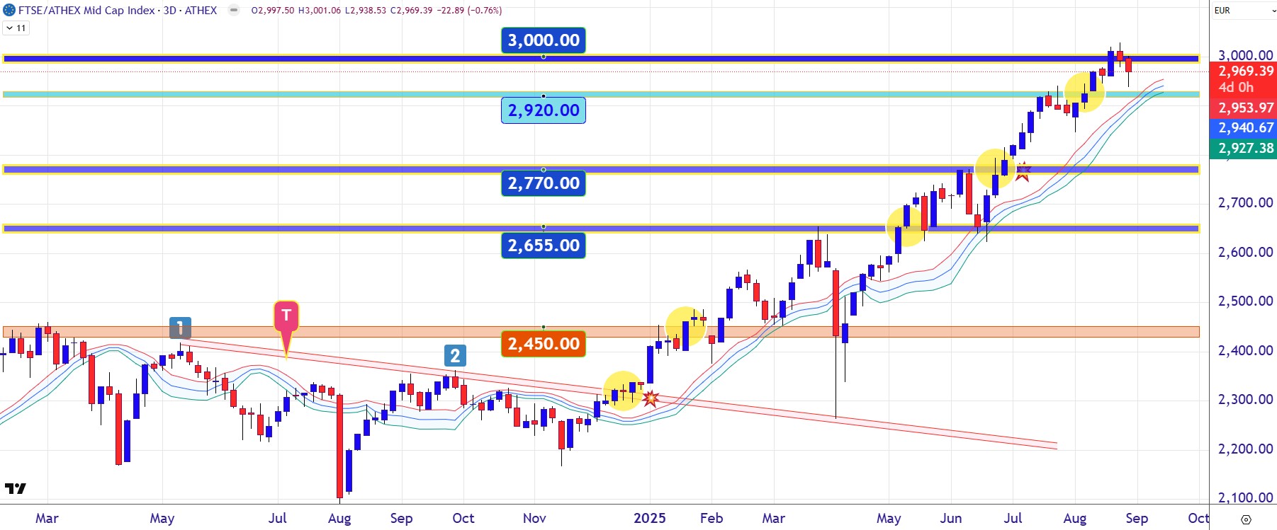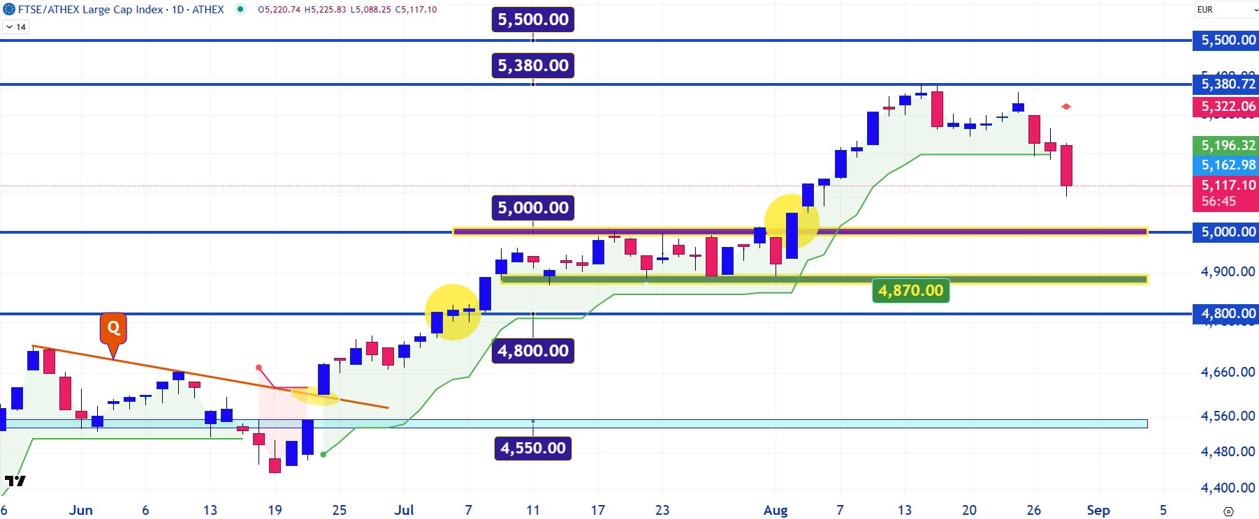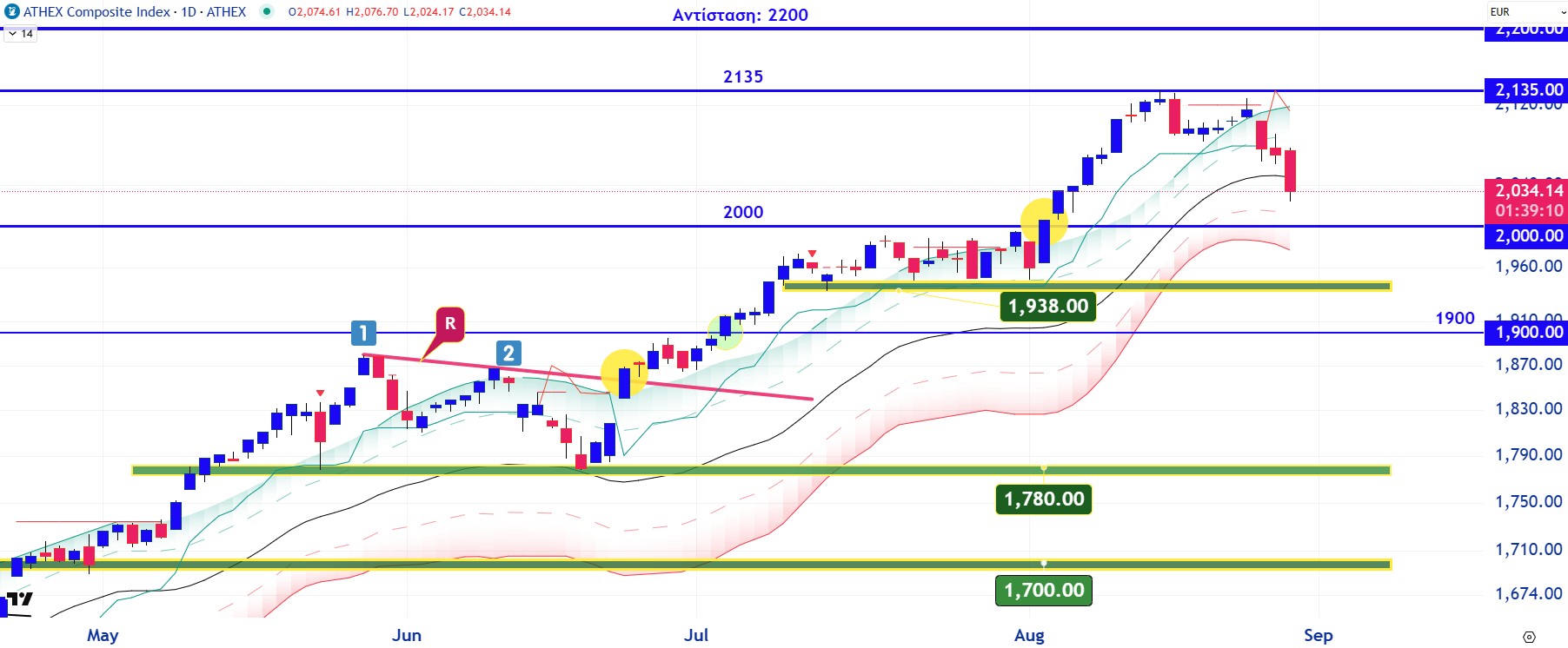Προσπάθεια αποφόρτισης των υπεραγορασμένων τεχνικών ταλαντωτών επιχειρεί στις τελευταίες συνεδριάσεις ο Γενικός Δείκτης του ελληνικού χρηματιστηρίου έπειτα από μια σχεδόν συνεχόμενη ανοδική κίνηση της τάξης του +20% από τα μέσα Ιουνίου. Η αγορά, βλέπετε, ξέρει ότι η βαρύτητα παραμονεύει στη γωνία. Το βραχυχρόνιο pullback έχει ως πρώτη ζώνη στήριξης τις 2.020 με 1.985 μονάδες και αμέσως μετά την καθοριστική για τη συνέχεια περιοχή των 1.938 με 1.900 μονάδων. Επίπεδο το οποίο δεν πρέπει να διαρραγεί καθοδικά, καθώς θα βάλει τους πωλητές στη θέση του οδηγού αλλάζοντας το μέχρι τώρα ανοδικό αφήγημα της αγοράς. Στην περίπτωση όμως που ο δείκτης δηλώσει αδυναμία καθοδικής διαπερατότητας της κάτω πλευράς των 1.985 μονάδων, τότε θα πρέπει να αναμένουμε μια εκ νέου επίθεση των αγοραστών προς τα υψηλά των 2.100 με 2.135 μονάδων.