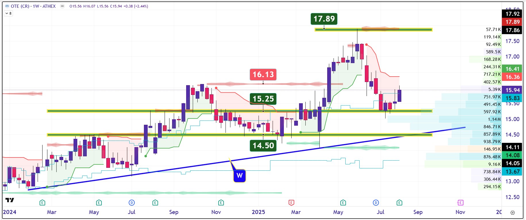 Εδώ διαγραμματικά έχουμε μια επαναφορά της μετοχής μέσα στο εύρος διαρκείας των 16,13 με 15,25 ευρώ, αρνούμενη να κρατήσει την επαφή με τα 17 ευρώ ευρώ, που θα μπορούσε να θέσει ως επόμενο στόχο την είσοδό της μέσα στη ζώνη 18 με 20 ευρώ.