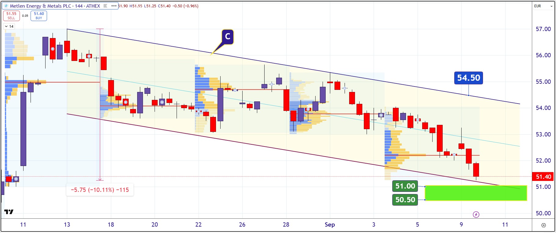Από απόψεως βραχυχρόνιας διαγραμματικής ανάλυσης, η Metlen έχει διορθώσει ένα -10% από τα υψηλά της κίνησης των 57 ευρώ ακουμπώντας πλέον πάνω στην πολύ ενδιαφέρουσα αγοραστική ζώνη της κάτω πλευράς του καναλιού “C” ανάμεσα στα 51 με 50 ευρώ. Περιοχή που είναι πολύ πιθανό να δώσει ευκαιρία τοποθετήσεων ενόψει και του rebalancing των δεικτών του FTSE-Russell την Παρασκευή 19 Σεπτεμβρίου στο κλείσιμο της συνεδρίασης.