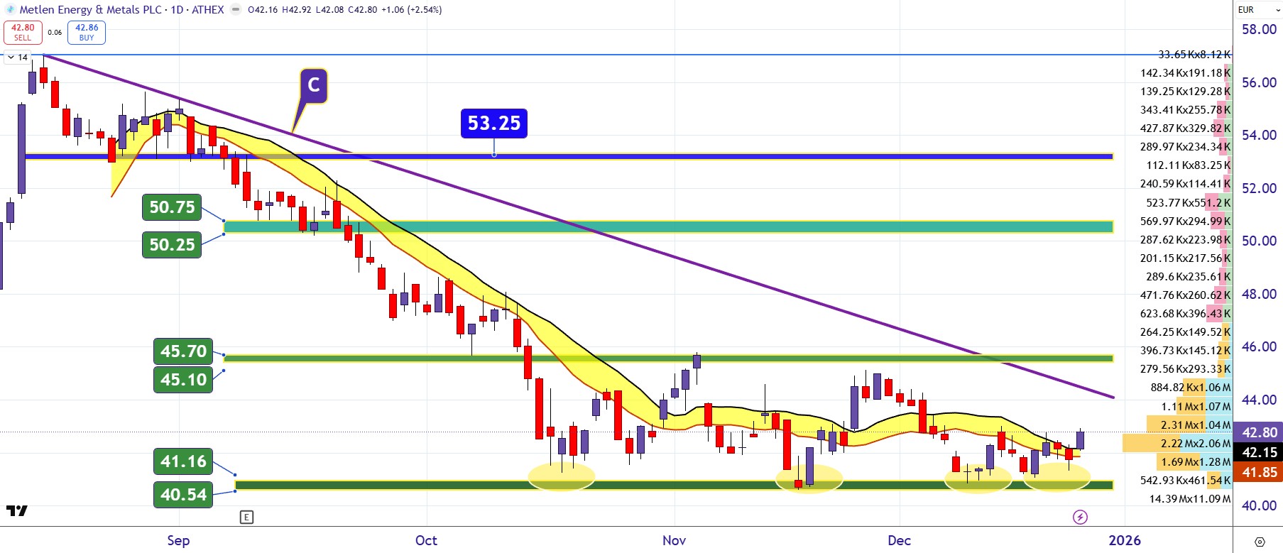 Διαγραμματικά φαίνεται στο ημερήσιο chart τιμών ότι όλη αυτή η συσσώρευση που έχει προκληθεί από τα μέσα του Οκτώβρη είναι έτοιμη να κινηθεί δυναμικά ανοδικά στις αρχές του 2026 σπρώχνοντας την τιμή της μετοχής πάνω από τη ζώνη αντίστασης των 50,25 με 50,75 ευρώ. Η μετοχή πάντως έχει όλα τα επενδυτικά χαρακτηριστικά για να διαπρέψει το 2026.