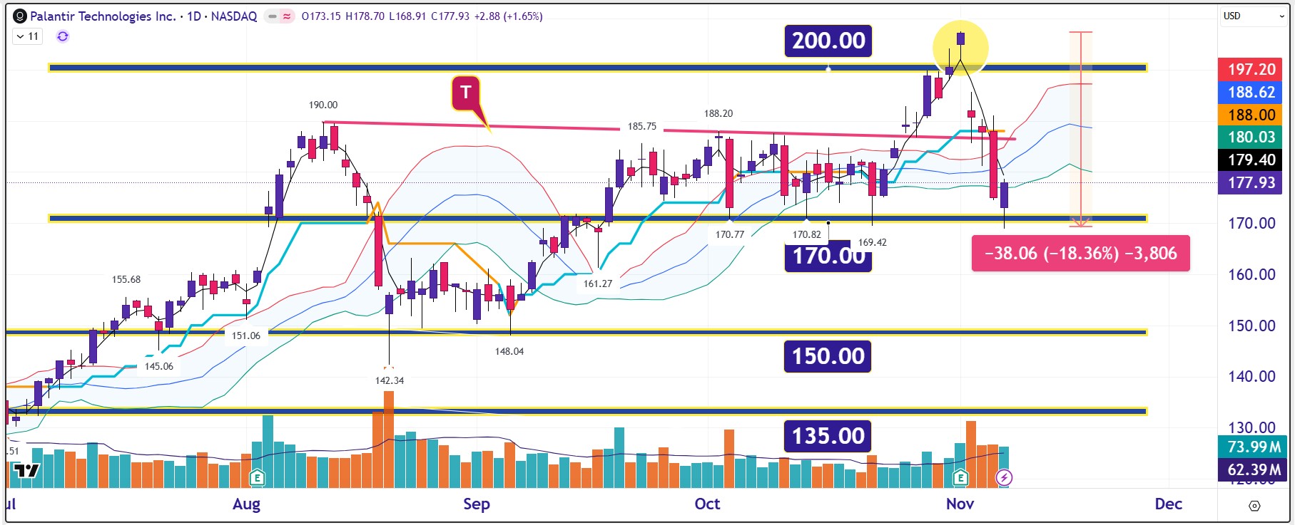 Από απόψεως τώρα διαγραμματικής ανάλυσης για τη μεν Nvidia το ζητούμενο είναι πρώτον να πάρει πάλι ανοδικά την άνω πλευρά του καναλιού “Q” στα $193 και δεύτερον να μη χάσει καθοδικά τα $174 με $170, ενώ για την Palantir η κατάσταση είναι πιο κρίσιμη καθώς μετά τη καθοδική διάλυση της γραμμής “Τ” στα $186 έχει χάσει τη γη κάτω από τα πόδια της γράφοντας τιμές κάτω και από το πολύ κρίσιμο επίπεδο στήριξης των 170 δολαρίων.