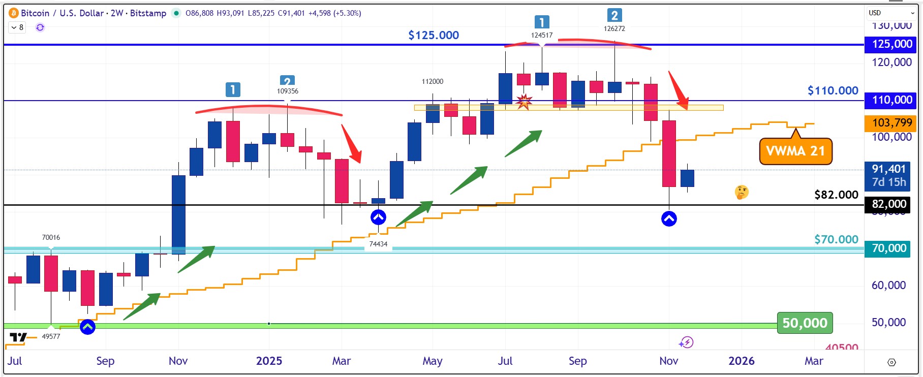 Το Bitcoin δείχνει να ανακάμπτει από τη ζώνη στήριξης των 82.000 δολαρίων αρπάζοντας 10.000 δολάρια ανοδικά, όμως διαγραμματικά η κίνηση μοιάζει περισσότερο με αντίδραση παρά με ουσιαστική αναστροφή τάσης. Η αγορά διατηρεί επιφυλακτικότητα: πολλοί traders παρακολουθούν με καχύποπτο βλέμμα. Σύμφωνα μάλιστα με τις τελευταίες εκτιμήσεις από traders στην πλατφόρμα Polymarket, υπάρχει πιθανότητα 74% το BTC να παραμείνει κάτω από τα 98.000 δολάρια μέσα στην επόμενη εβδομάδα – ένδειξη ότι το ράλι δεν έχει πείσει ότι είναι βιώσιμο.