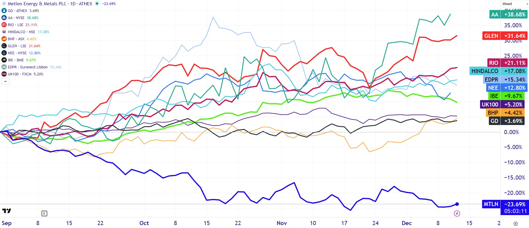 Εκεί ακριβώς είναι το πρώτο, και πιο αμείλικτο, στοιχείο της υποτίμησης. Στο διάγραμμα που αποτυπώνει την ποσοστιαία πορεία από τις αρχές Σεπτεμβρίου, εταιρείες όπως η Alcoa (+38,68%), η Glencore (+31,64%), η Rio Tinto (+21,11%), η Hindalco (+17,08%), η Iberdrola (+9,67%), η NextEra (+12,80%) και η EDP Renováveis (+15,34%) κινούνται σε μια ολοφάνερη ανοδική καμπύλη. Η Metlen, αντίθετα, παραμένει στο -23%, ανοίγοντας μια απόσταση που δεν βρίσκει εύκολα αντίστοιχη σε άλλον ευρωπαϊκό όμιλο με τόσο ισχυρή θεμελιώδη βάση, τόσο έντονη κερδοφορία και τόσο ευρύ φάσμα δραστηριοτήτων.