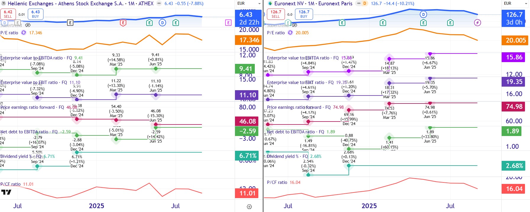 - EV/EBITDA 9,41x για την ΕΧΑΕ έναντι 15,86x της Euronext.