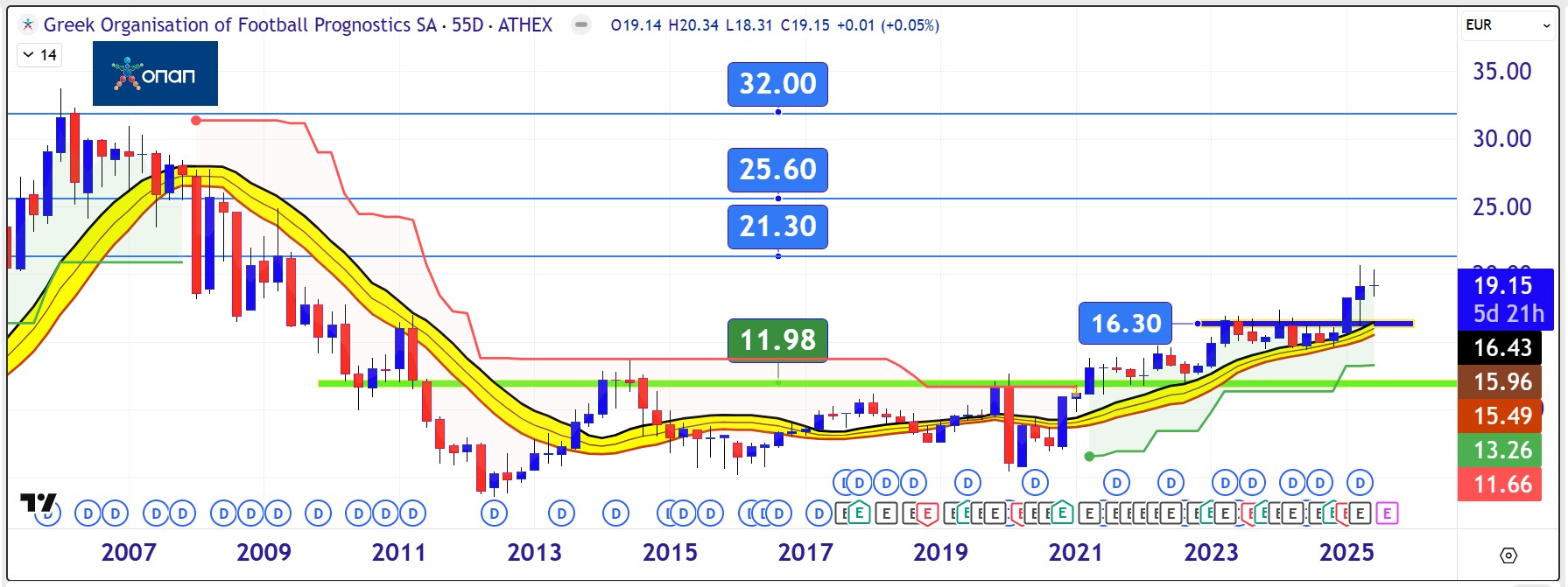 Από διαγραμματικής απόψεως, η μετοχή του ΟΠΑΠ στο μακροπρόθεσμο Fibo chart των 55 ημερών δείχνει ότι μετά την ανοδική διάλυση της αντίστασης των €16,30 έχει βάλει πλώρη για τα €21,30 που έγραφε τον Ιούνιο του 2009. Πάνω από εκεί, η μετοχή θα αρχίσει να μελετά την είσοδό της μέσα στο μεγάλο εύρος διακύμανσης του 2008 ανάμεσα στα €25,6 με €32.