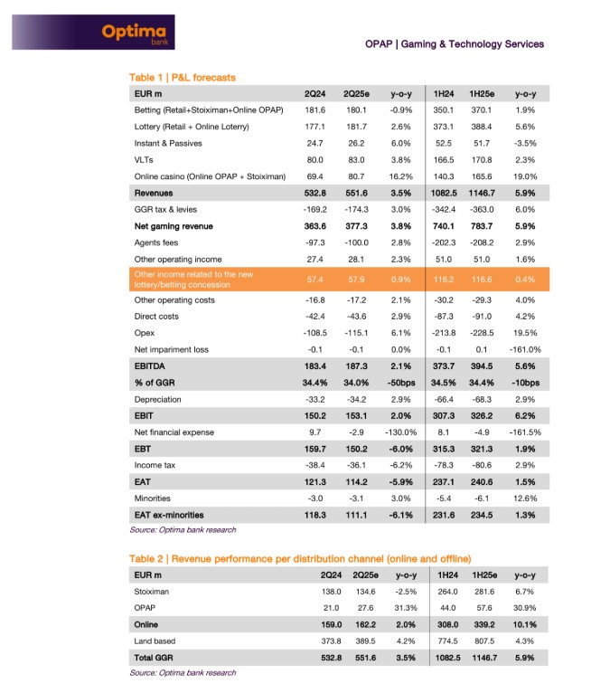 Η Optima εκτιμά ότι ο ΟΠΑΠ βρίσκεται σε τροχιά υπέρβασης των στόχων της διοίκησης, που μιλούν για αύξηση του Gross Gaming Revenue (το σύνολο των χρημάτων που ποντάρουν οι παίκτες μείον τα κέρδη που επιστρέφονται σε αυτούς) σε χαμηλό μονοψήφιο ποσοστό και περιθώριο EBITDA στο 35%. Για το πρώτο εξάμηνο του 2025, η εκτίμηση είναι ότι το Gross Gaming Revenue θα εμφανίσει άνοδο περίπου 6%, με περιθώριο EBITDA 34,4%. Παράλληλα, διατηρεί αγοραστική σύσταση για τη μετοχή, βλέποντας περιθώριο ανόδου περίπου +20% από τα τρέχοντα επίπεδα, συμπεριλαμβανομένων και των μερισμάτων.