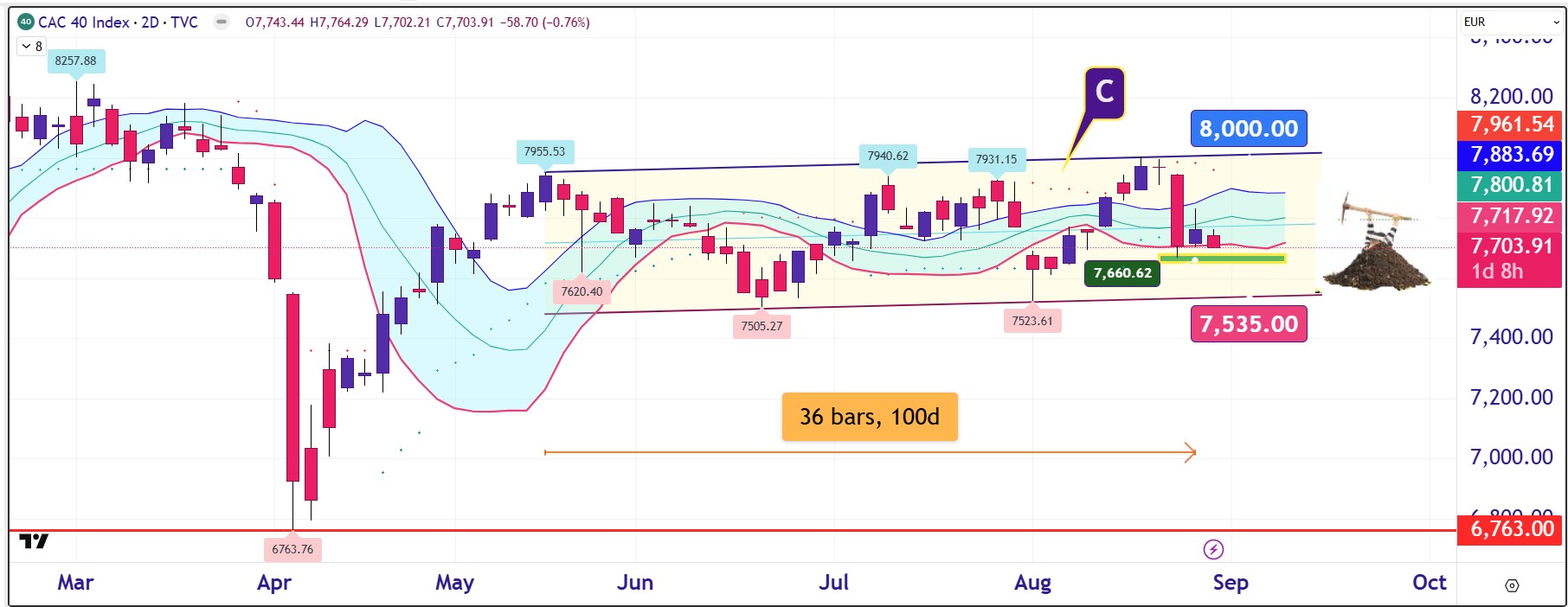 Διαγραμματικά πάντως ο γαλλικός δείκτης CAC 40 συνεχίζει να λαμβάνει τιμές εδώ και 100 μέρες μέσα στο πλάγιο κανάλι “C” που έχει ως άνω όριο τις 8.000 μονάδες και ως κάτω τις 7.535 μονάδες. Φυσικά μια τμήση του κάτω ορίου θα φέρει τα πάνω – κάτω στη γαλλική αγορά με πιθανή κίνηση προς τις 7.000 μονάδες.