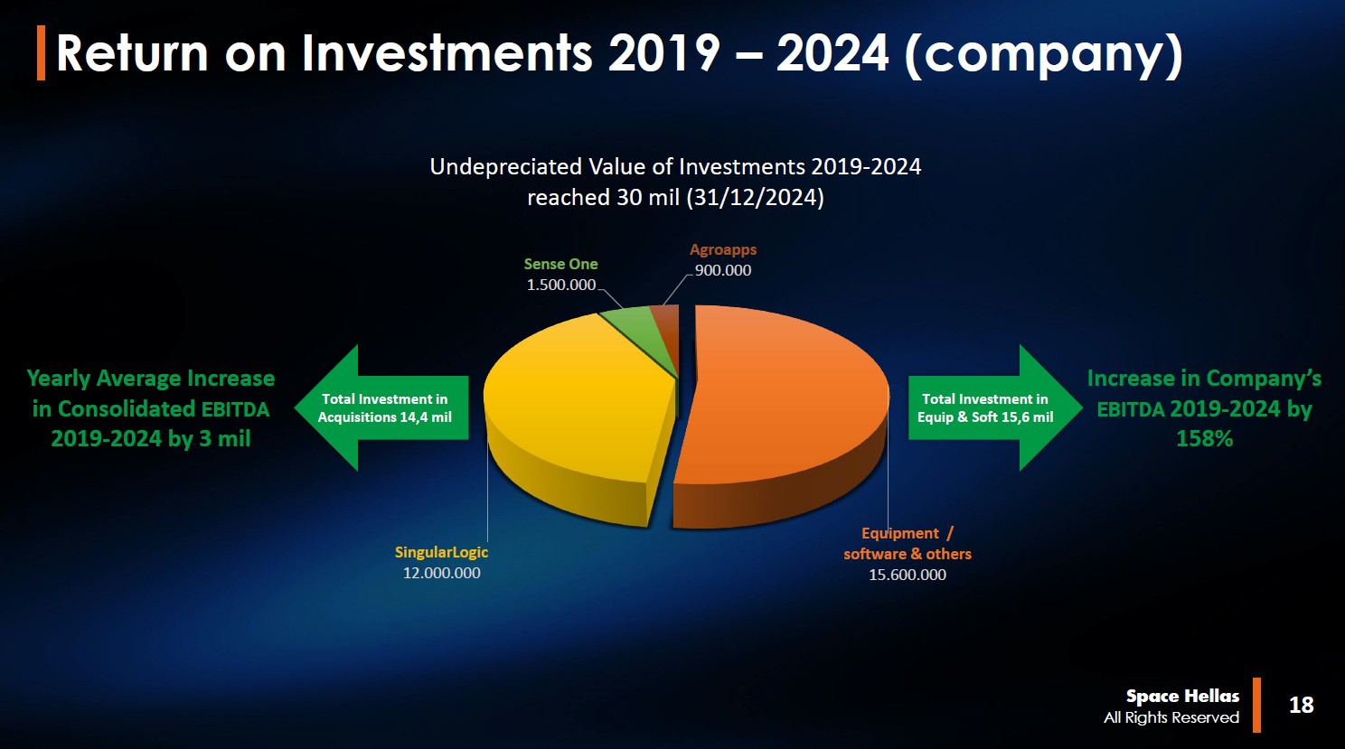 Προσέξτε η πενταετία 2019 – 2024 ήταν ο κύκλος των μεγάλων επενδύσεων, όπου η Space Hellas έπαιξε άμυνα και ταυτόχρονα “έχτισε οπλοστάσιο” για την επόμενη μέρα. Επένδυσε €15,6 εκατ. σε εξοπλισμό και λογισμικό, δημιουργώντας υποδομές αιχμής, και διέθεσε €14,4 εκατ. σε στρατηγικές εξαγορές (SingularLogic, SenseOne, AgroApps), ενισχύοντας το οικοσύστημα των λύσεών της. Αυτές οι κινήσεις έγιναν για να φτιάξουν γερές βάσεις παραγωγής κερδοφορίας στο αύριο. Και το αποτέλεσμα μιλά από μόνο του καθώς το EBITDA εκτοξεύτηκε κατά 158% σε μια πενταετία, αποδεικνύοντας ότι η στρατηγική αυτή απέδωσε πολλαπλασιαστικά.