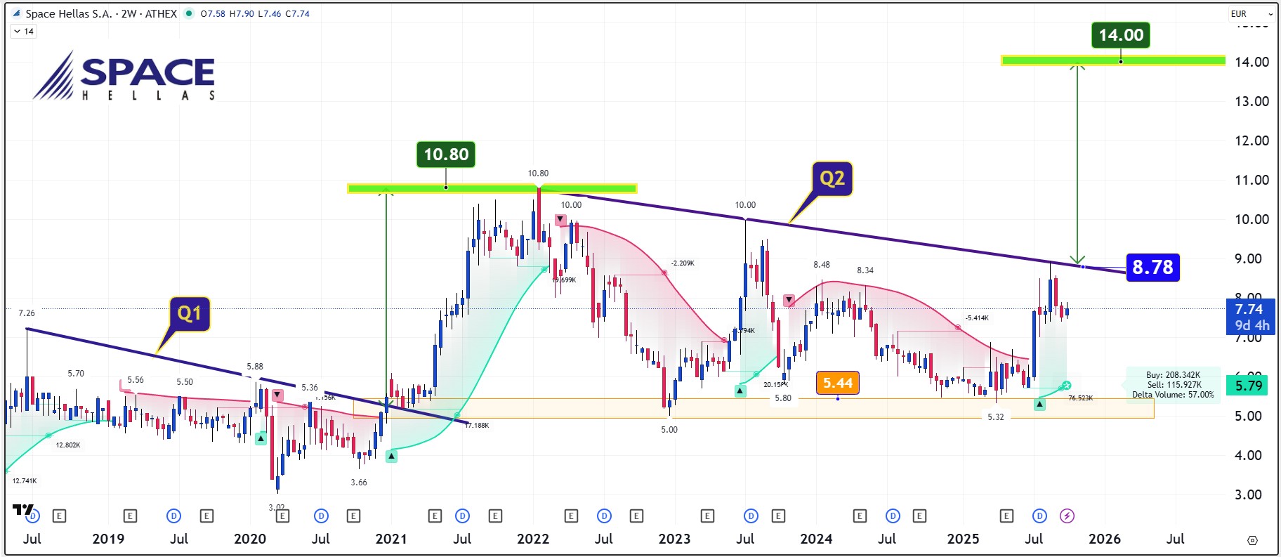 Διαγραμματικά η μετοχή δείχνει να ετοιμάζεται να δοκιμάσει τις δυνάμεις της πάνω στη μακροπρόθεσμη καθοδική γραμμή “Q2” στα €8,78. Πάνω από εκεί η Space αλλάζει πίστα και μετοχικά βάζοντας ως στόχο την περιοχή των €14,00.