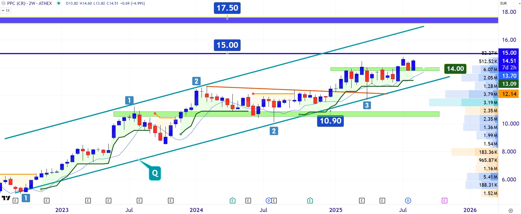 Από διαγραμματικής απόψεως όσο η μετοχή κρατάει σε επίπεδο ημερήσιων κλεισιμάτων τη βάση των 14 ευρώ τόσο θα ανοίγει τον δρόμο για να περπατήσει προς την άνω πλευρά του μακροπρόθεσμου ανοδικού καναλιού στα 16,80 με 17,50 ευρώ.