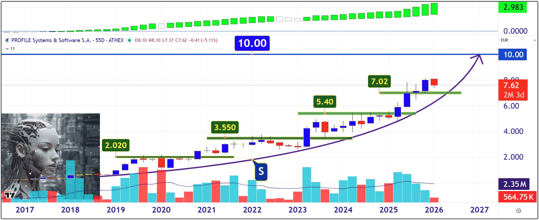 Από πλευράς διαγραμματικής ανάλυσης δεν έχω και πολλά πλέον να πώ μιας που εδώ και πολλά χρόνια ο δρόμος της ανόδου έχει χαραχτεί από τον μακροπρόθεσμο στροφέα “S” που μπορεί να φέρει τη τιμή της μετοχής πάνω από τα €10 και πρός τα €12.