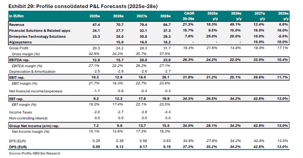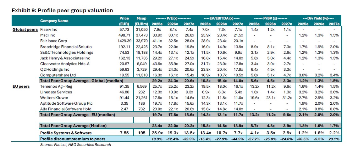 Σε επίπεδο αποτίμησης, η NBG χρησιμοποιεί συνδυασμό DCF και πολλαπλασιαστή EV/EBITDA 2026e στο 14,8x, καταλήγοντας σε τιμή-στόχο €10. Το DCF, με WACC 8,3% και terminal growth 2%, δίνει αξία €9,18 ανά μετοχή πριν τον συνδυασμό. Εδώ όμως κρύβεται το πραγματικό “ζουμί” της έκθεσης, γιατί το Exhibit 9 βάζει την Profile σε διεθνή κάδρο και δείχνει αριθμητικά το discount που συνεχίζει να κουβαλάει, παρότι το μοντέλο της έχει χαρακτηριστικά “software quality”.